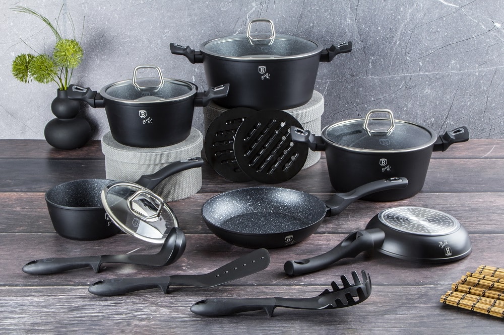 Komplekt sisaldab kõike vajalikku igapäevaseks toiduvalmistamiseks: potte, pannkoogipanni ja kastmepotte erinevateks otstarveteks, samuti ergonoomilisi käepidemeid, mis tagavad mugava kasutamise. 3-kihiline mittelibs marmorist katmine võimaldab kergelt valmistada ja puhastada nõusid ning elegantne must disain annab luksust igale köögi sisekujundusele.