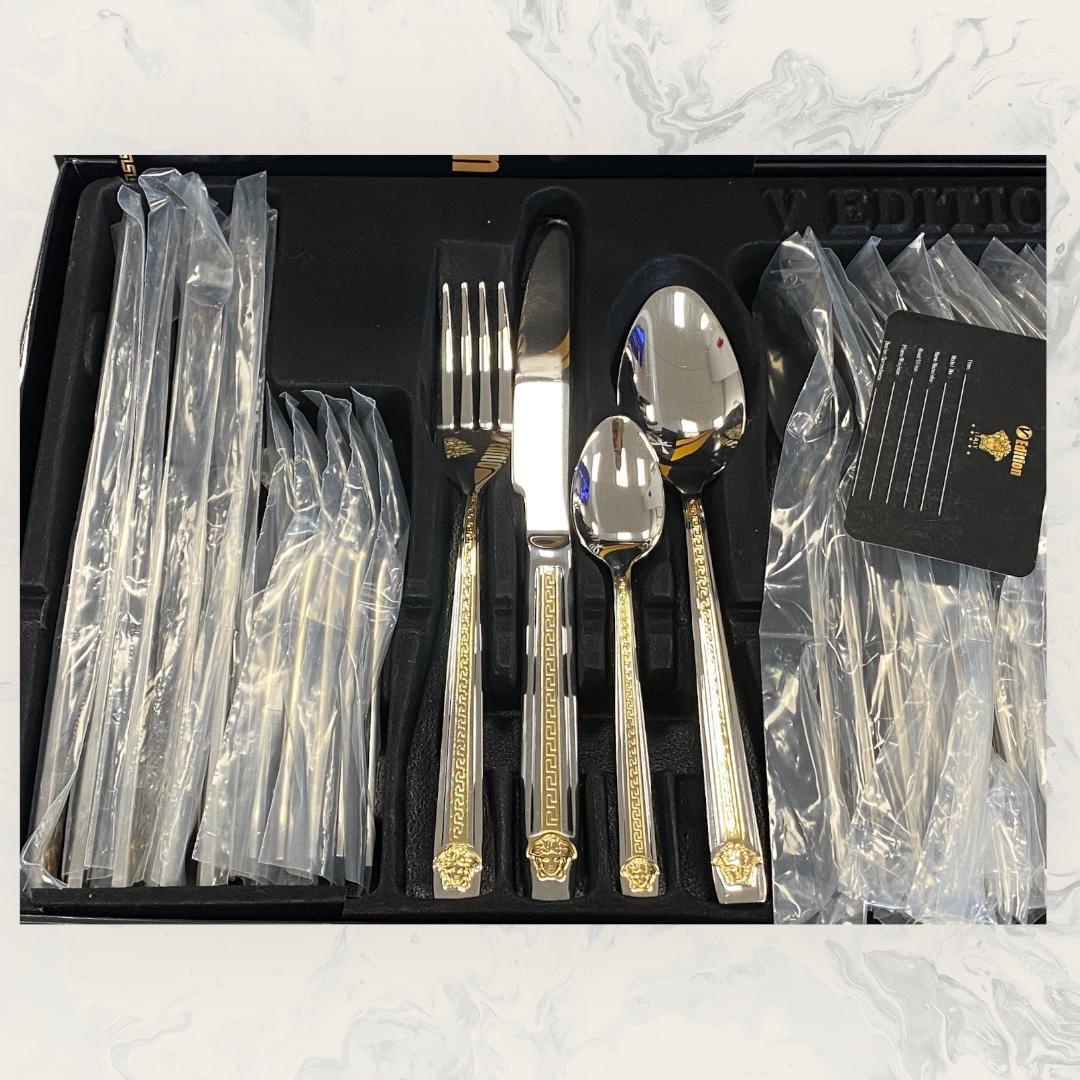 - : komplekt on pakendatud stiilsesse karpi koos „Versace“ logoga, rõhutades selle erilisust.
