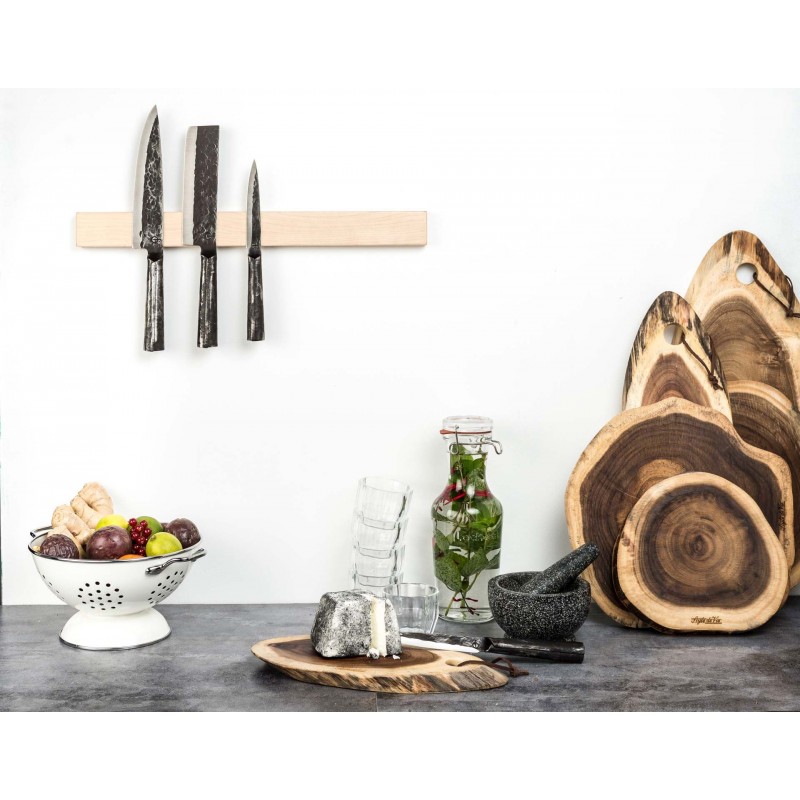 See kvaliteetne akaatsiapuidust serveerimislaud on aasa ja nahkrihmaga – tänu millele on serveerimine palju meeldivam. Iga laud on oma kuju ja mõõtmete poolest unikaalne ning sellel on iseloomulik puidusüü.