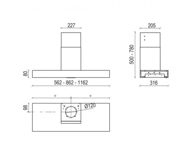 Universaalne, 56 cm laiune õhupuhasti, mis on mõeldud paigaldamiseks seinale (T-kujulisena) või täielikult kapi sisse integreerimiseks. Sobib kasutamiseks nii õhu väljatõmbe- kui ka retsirkulatsioonirežiimis.