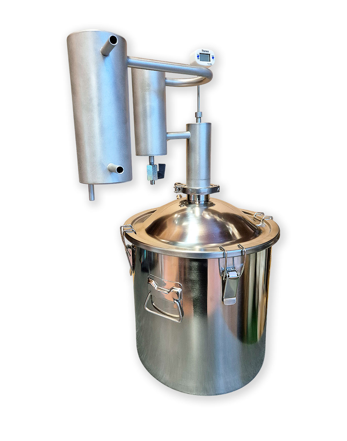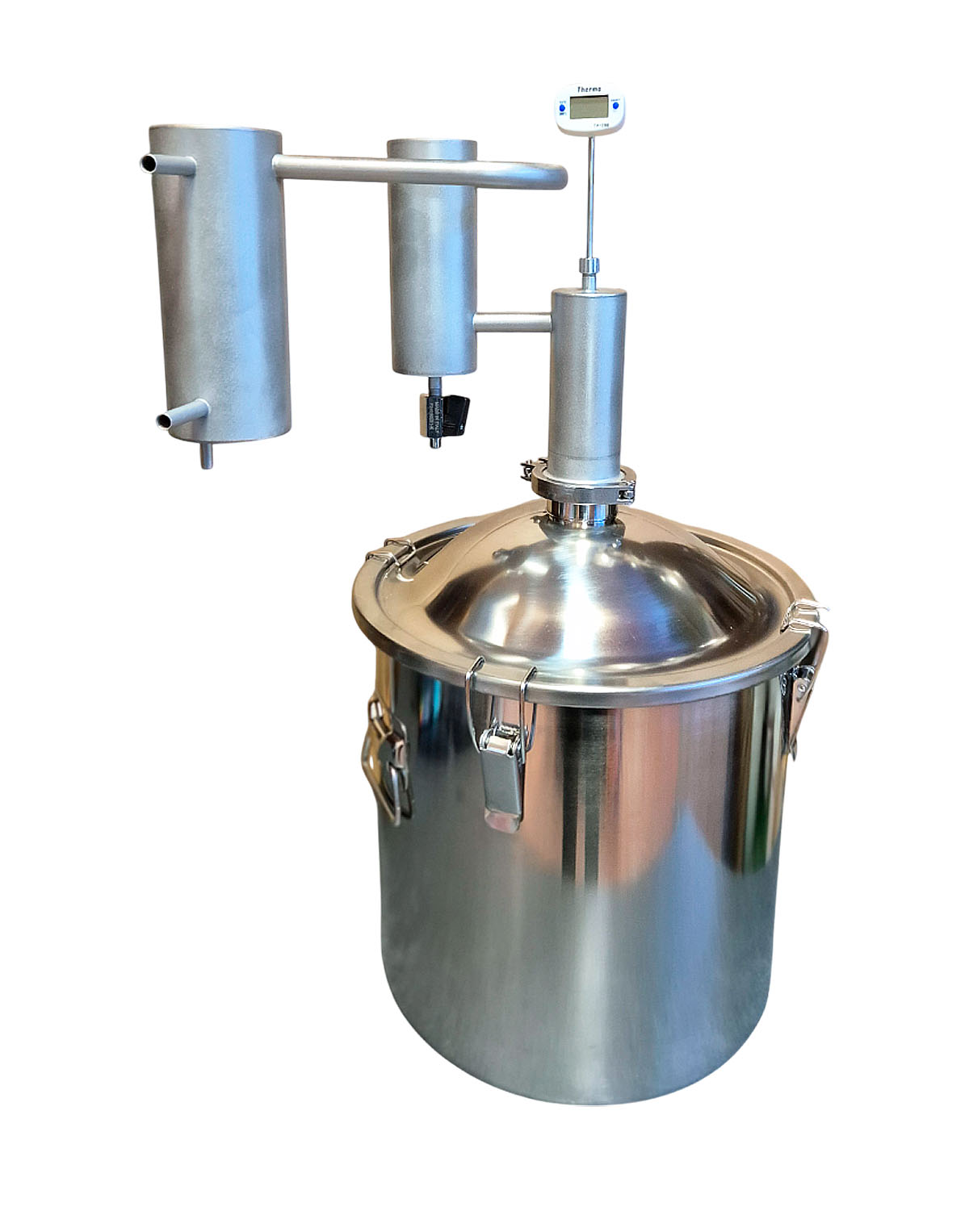 2) Kuppelkaane ja 2″ klamberühendusega (rangühendusega) 21 l destillatsioonikatel (-anum). Valmistatud roostevabast terasest AISI 304 (seinad ja kaas), AISI 430 (põhi);