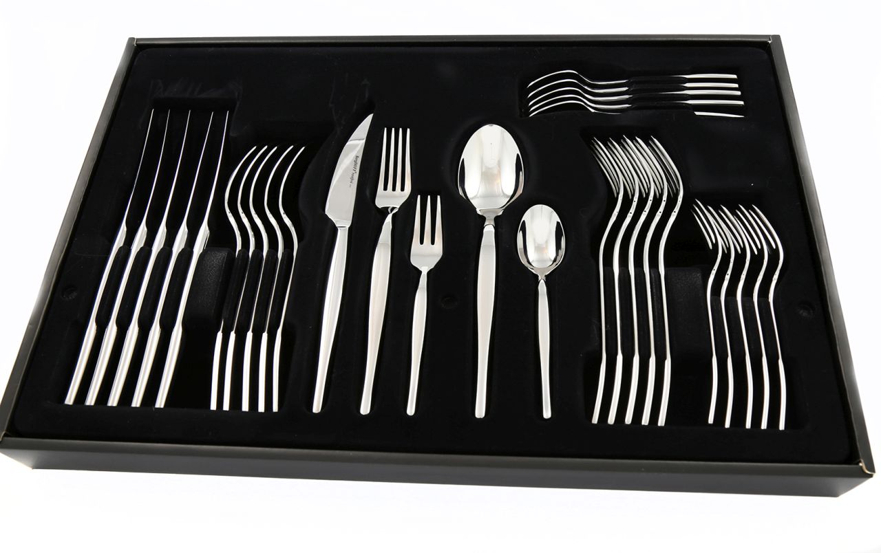 Komplektis on kõik, mida vajate 6 inimese laua serveerimiseks: lauanoad, kahvlid, lusikad, teelusikad ja magustoidu kahvlid. Peene saagja servaga noaterad sobivad suurepäraselt ka lihatoitude lõikamiseks.
