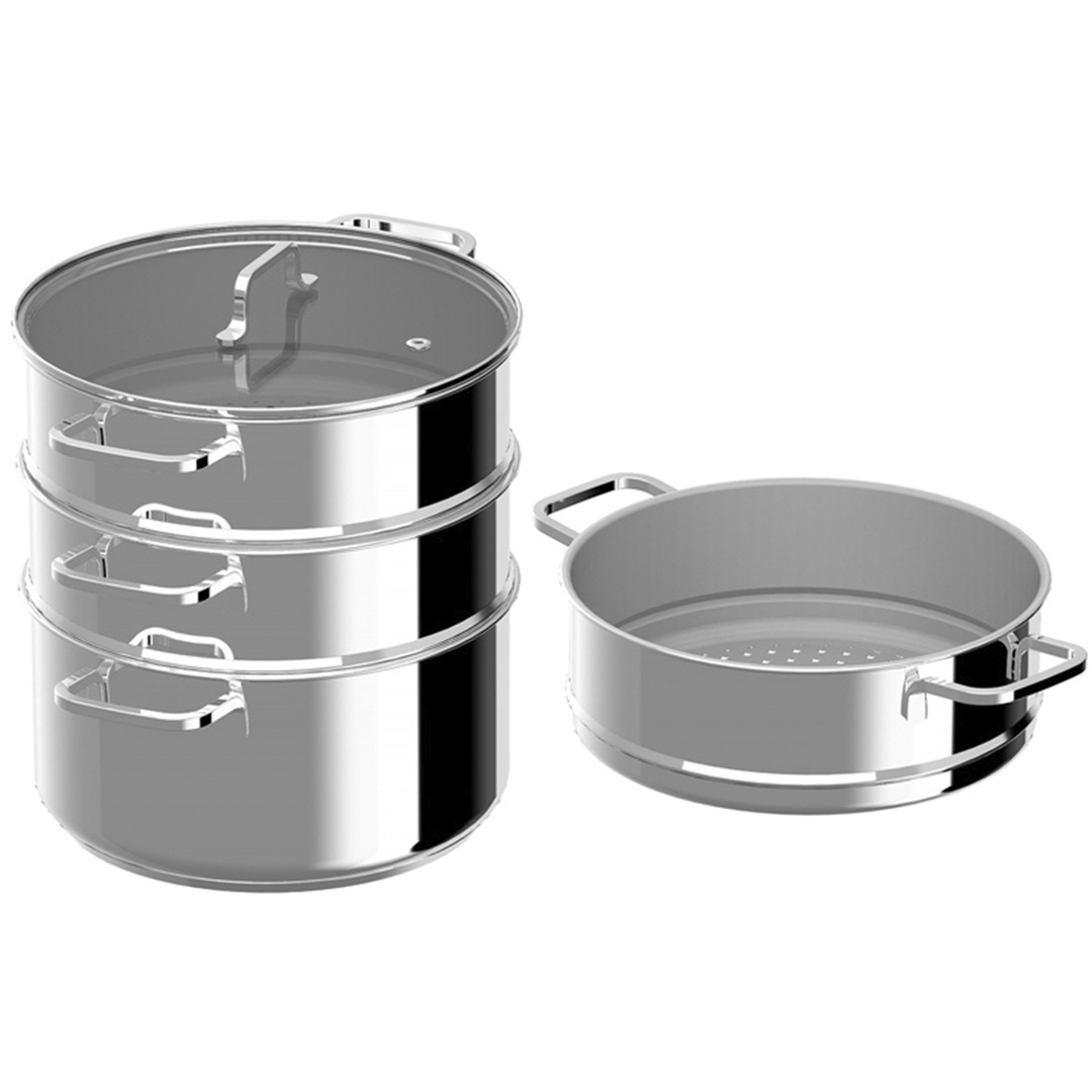 See mitmekülgne komplekt koosneb suurest alumisest potist ja kolmest selle peale asetatud aurutuslisast. See võimaldab luua kuni 4-korruselise süsteemi: alumises potis saate keeta kartuleid või riisi ning ülemistel korrustel samal ajal aurutada köögivilju, kala või kana. Tooted ei kaota oma maitset ja aroomi, kuna aur ringleb korruste vahel.