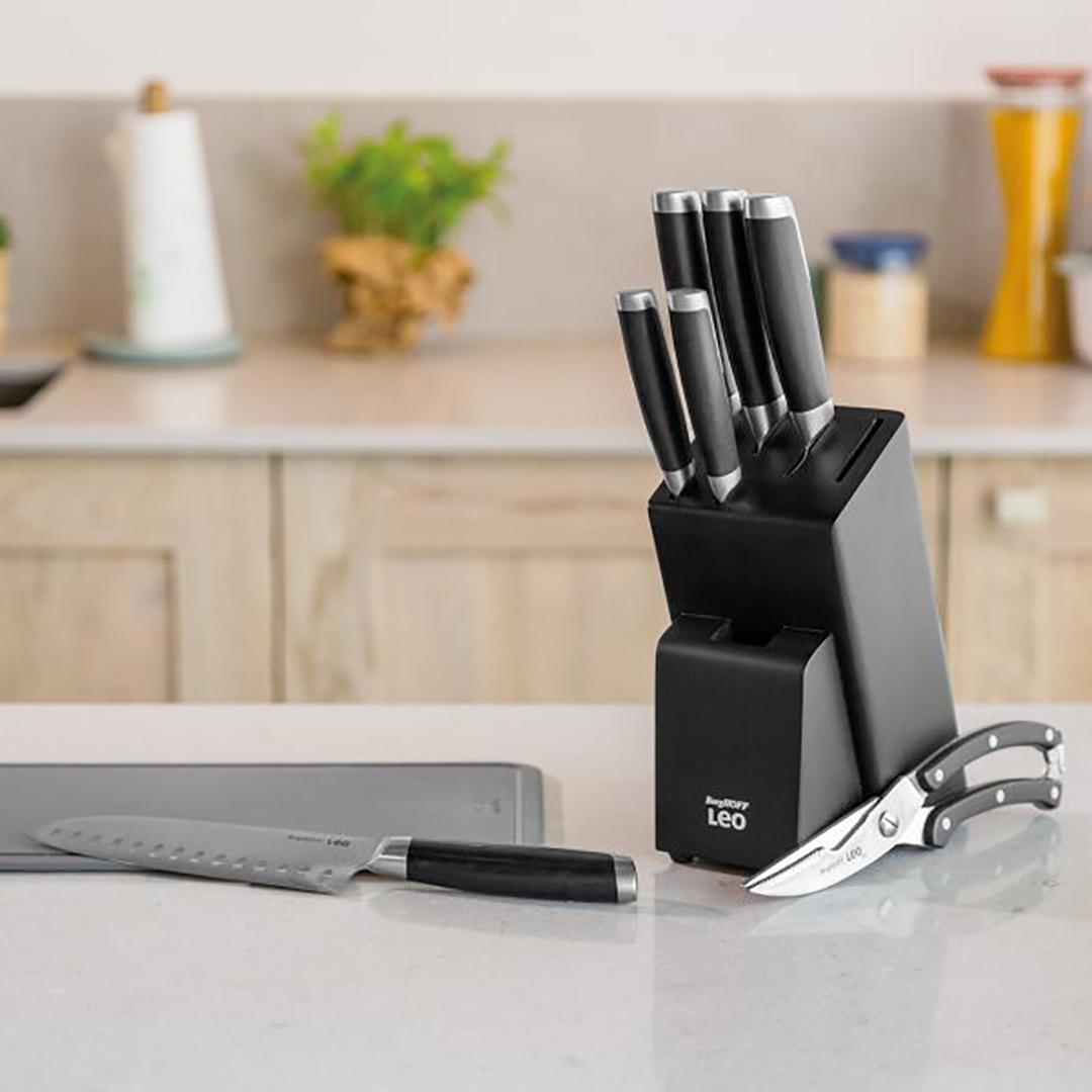 - ✅ Laiendatav alus: Mustal puidust alusel on lisakohad kääridele ja Santoku noale.