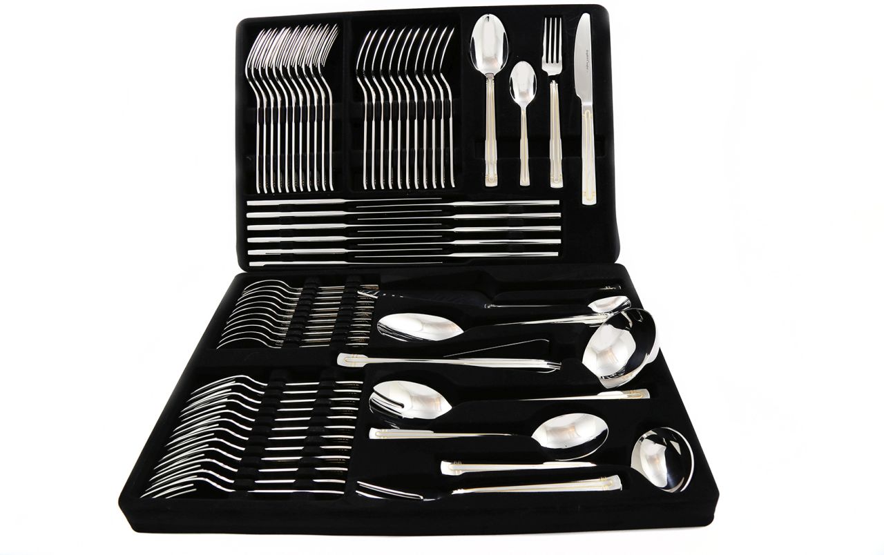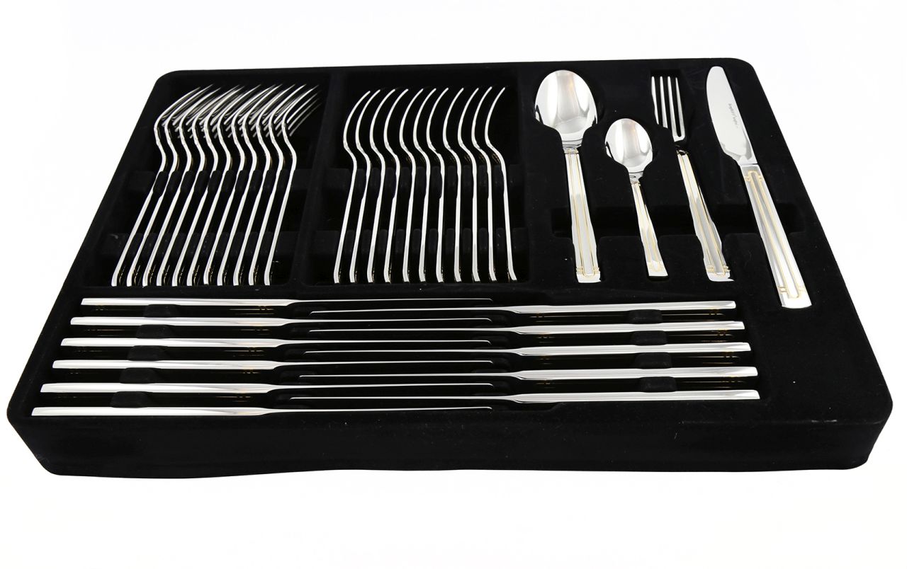 Täielik 72-osaline söögiriistade komplekt, mis on mõeldud 12 inimesele. Komplekt sisaldab kõiki võimalikke tööriistu – alates põhilistest kuni serveerimisvahenditeni – mis on vajalikud luksuslikuks laua katmiseks. Ideaalne kingitus pulmadeks, majapidamispidudeks või muuks oluliseks sündmuseks.
