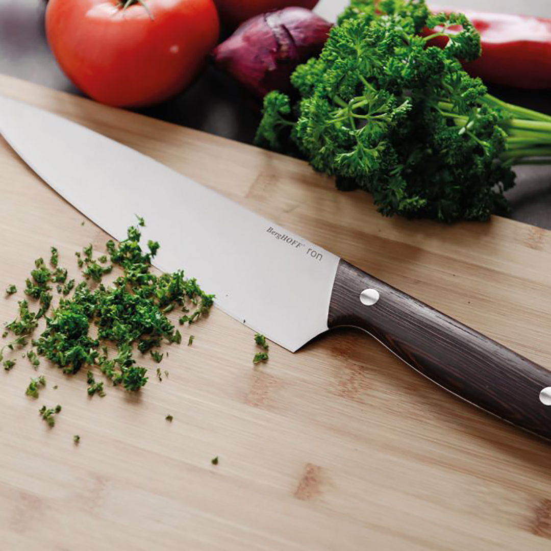 BergHOFF “Ron” seeria – see on auhinnatud disain, milles kohtuvad looduslikud materjalid ja professionaalne funktsionaalsus. See koka nuga ei ole mitte ainult laitmatult toimiv tööriist, vaid ka silmapaistev köögiaktsent. Kontrastsete mustade terade ja sooja puidust käepideme kombinatsioon on loodud neile, kes hindavad esteetikat ja kvaliteeti.