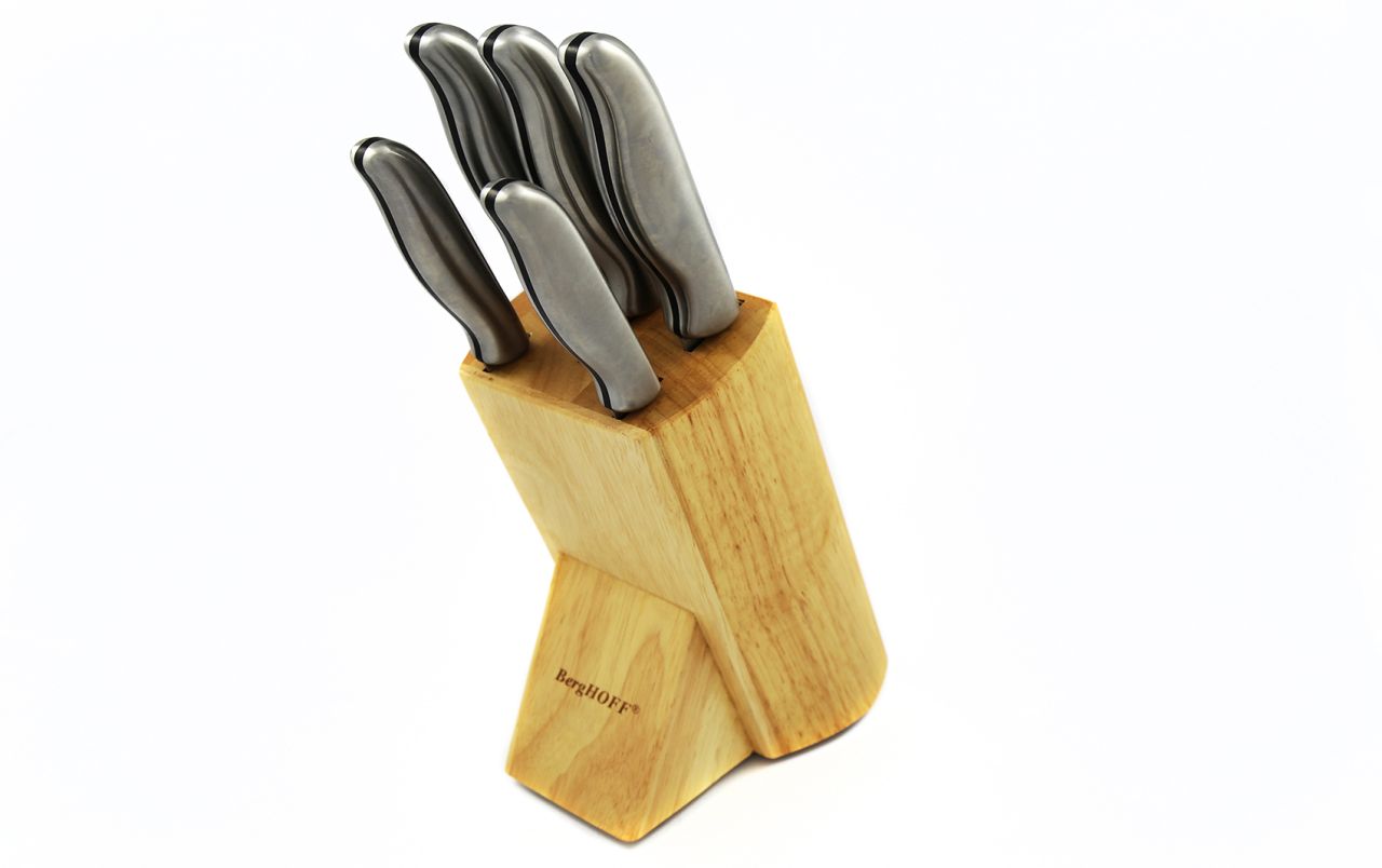 - Komplekt sisaldab 5 olulist kööginuga ja ühte puidust alust nende hoidmiseks.