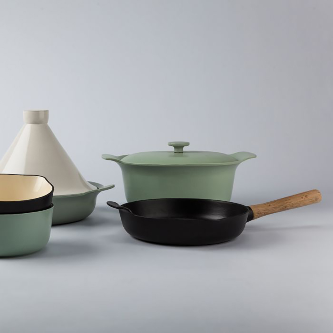Stiilne ja ergonoomiline puidust käepide ei näe mitte ainult ilus välja, vaid on ka mugav haarata. Raske malmkaane siseküljel on spetsiaalsed kühmu, mis toimivad iseniisutussüsteemina – aur kondenseerub ja tilgub tagasi toidule, niisutades seda pidevalt ja hoides ära kuivamise.