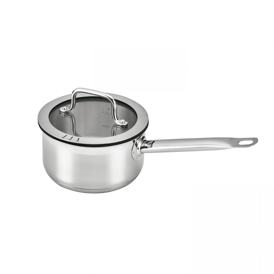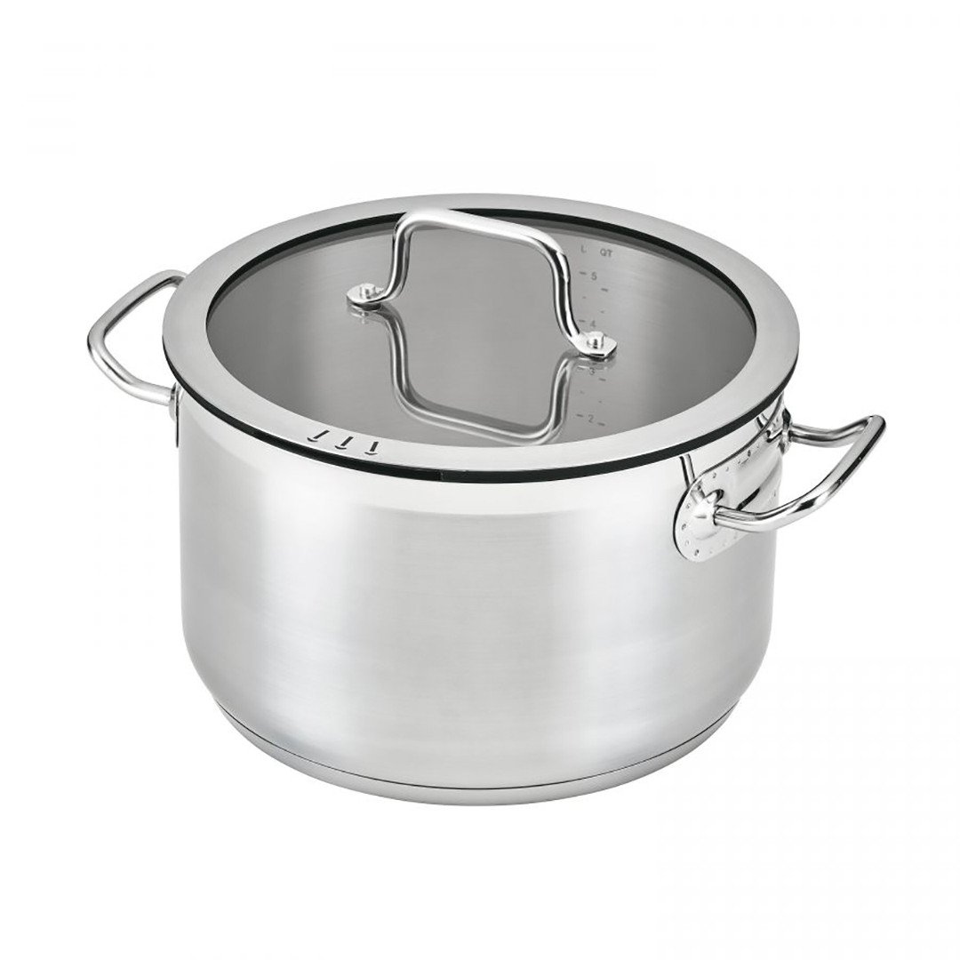 Potid ja pann on valmistatud kõrgekvaliteedilisest 18/10 roostevabast terasest, mis on vastupidav, hügieeniline ega muuda toidu maitset. Stiilne matt viimistlus koos läikiva ribaga peal näeb välja soliidne. Spetsiaalne 3-kihiline termoakumuleeriv põhi tagab kiire kuumenemise ja säästab energiat, samas kui sisemine liitrimõõdik ja kuumakindlad käepidemed pakuvad täiendavat mugavust.