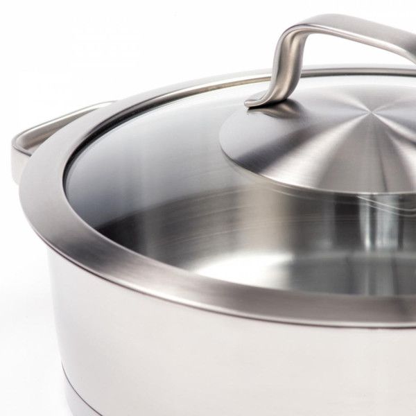Spetsiaalne 3-kihiline termoakumuleeriv põhi tagab kiire kuumenemise, ideaalselt ühtlase soojusjaotuse ja hoiab soojust kaua. See võimaldab toiduvalmistamisel energiat säästa. Mugavuse tagamiseks on sisemine mahu skaala, mittekuumenevad käepidemed ja klaasist kaas, mis võimaldab toiduvalmistamisprotsessi jälgida.