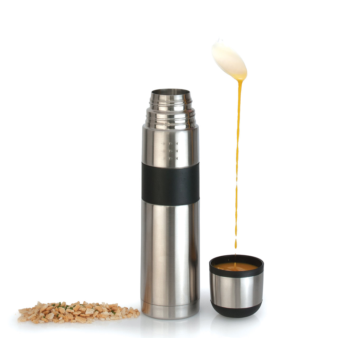 - Mugav ja funktsionaalne disain: Elegantne ja praktiline termos on varustatud mugava käepidemega. Nupuvajutusega valamise süsteem võimaldab jooki valada ilma kogu korki maha keeramata, vältides seeläbi soojuskadu. Lisaks toimib kaas mugava tassina.