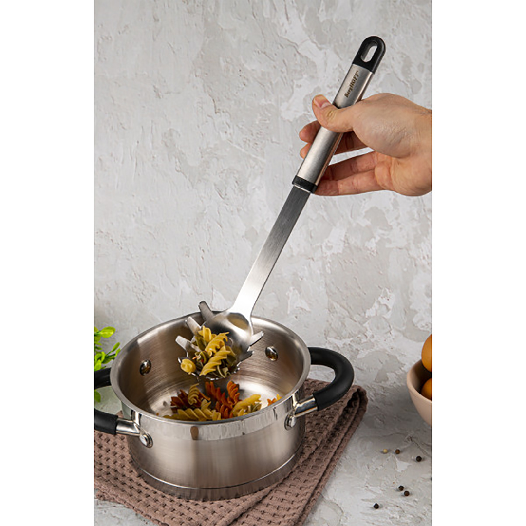 Tutvustame BergHOFF Essencials spagetilusikat – tööriista, mis muudab iga pastaõhtu veelgi nauditavamaks. Spetsiaalselt loodud disain pikkade hammastega võimaldab kindlalt ja turvaliselt haarata libedaid spagette, linguine’t või tagliatelle’t, takistades neil tagasi potti libisemist. See on elegantne ja funktsionaalne lahendus, mis tagab, et iga portsjon näeb taldrikul välja laitmatu.