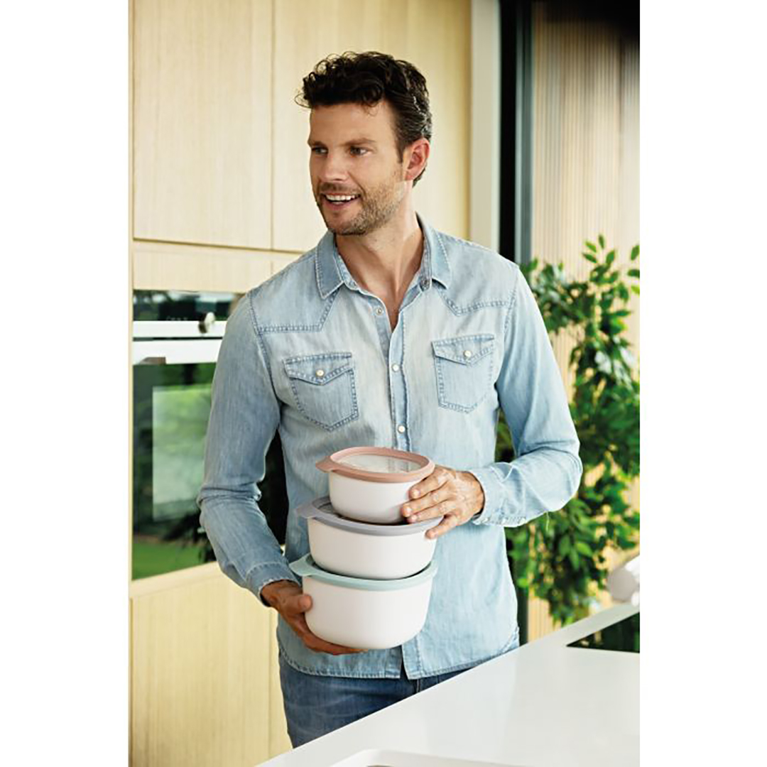 Kolmeosaline universaalne toidukonteinerite komplekt tihedate kaantega. Mõeldud toiduainete hoidmiseks külmkapis, sügavkülmas või kappides, transportimiseks ja soojendamiseks mikrolaineahjus (ilma kaaneta).
