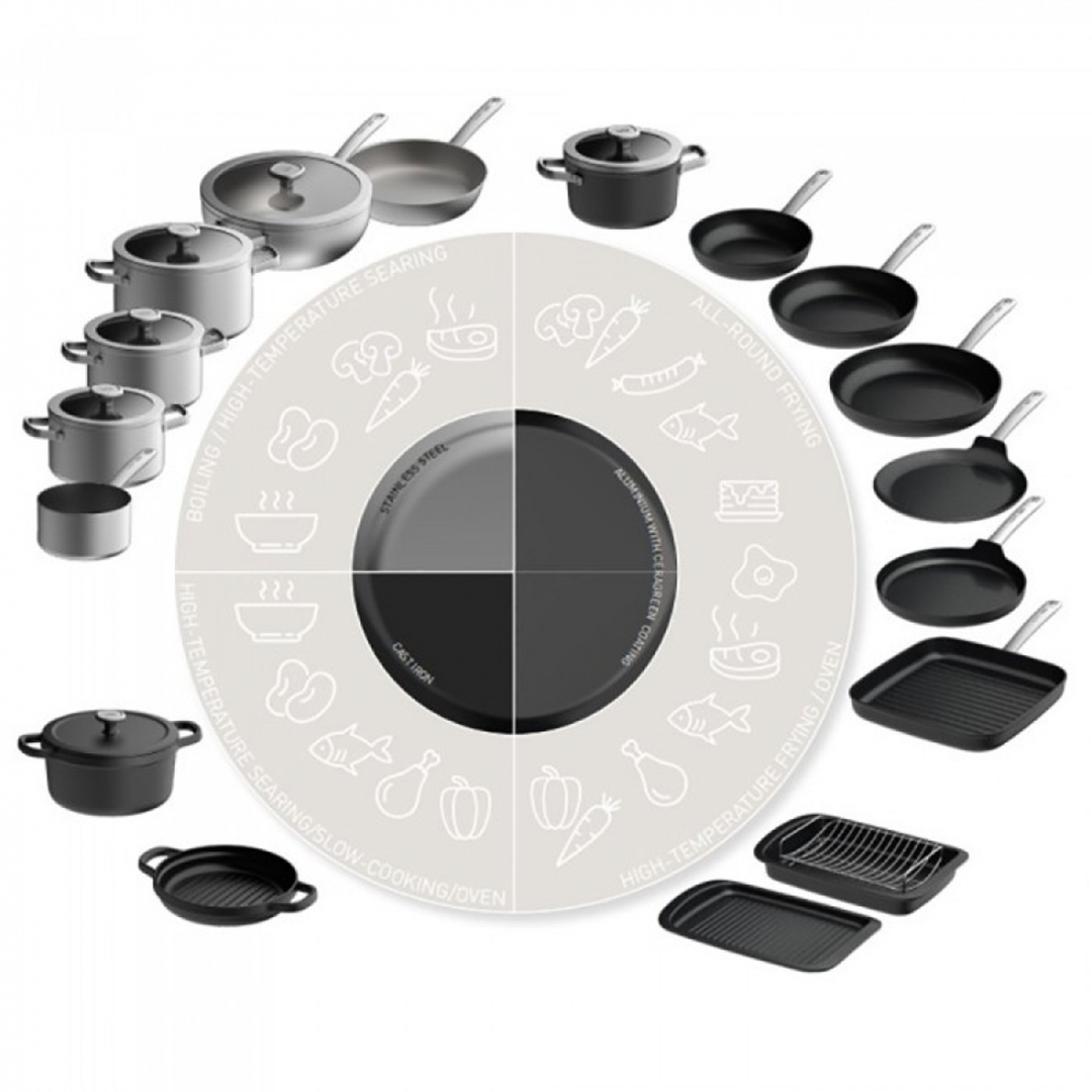 - Professionaalne kuumutamine: Paks, 3-kihiline patenteeritud termoakumulatiivne põhi täieliku induktsioonkettaga tagab välkkiire ja ideaalselt ühtlase soojusjaotuse kõikidel pliiditüüpidel. Pann kuumeneb kiiresti ja hoiab soojust kaua, muutes toiduvalmistamise tõhusaks ja ökonoomseks.