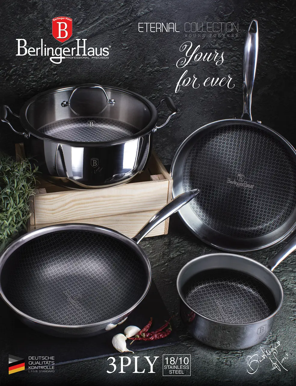 Eternal Collection on Berlinger Hausi uudse 3D-kattega savinõusari. Pannid on valmistatud 18/10 roostevabast terasest. Neil on 3-kihiline akutermiline põhi, mis kogub suurepäraselt soojust ja jaotab selle ühtlaselt kogu nõude pinnale. 3D-kate kantakse peale kärgvõre kujul. See kate on äärmiselt vastupidav ja kriimustuskindel. See võimaldab praadida ja küpsetada minimaalse rasvasisaldusega. Toit ei põle isegi kõrgel temperatuuril küpsetamisel. Valik sobib igat tüüpi pliitidele – sealhulgas gaasi-, elektri-, keraamilistele ja induktsioonpliitidele. Kate on viis korda tugevam kui teflon- ja graniitkatted. Selle tulemusel serveeritakse nõusid palju aastaid ilma oma omadusi kaotamata. Nende vaieldamatu eelis on lihtne puhastamine. Nõusid saab pesta nõudepesumasinas.