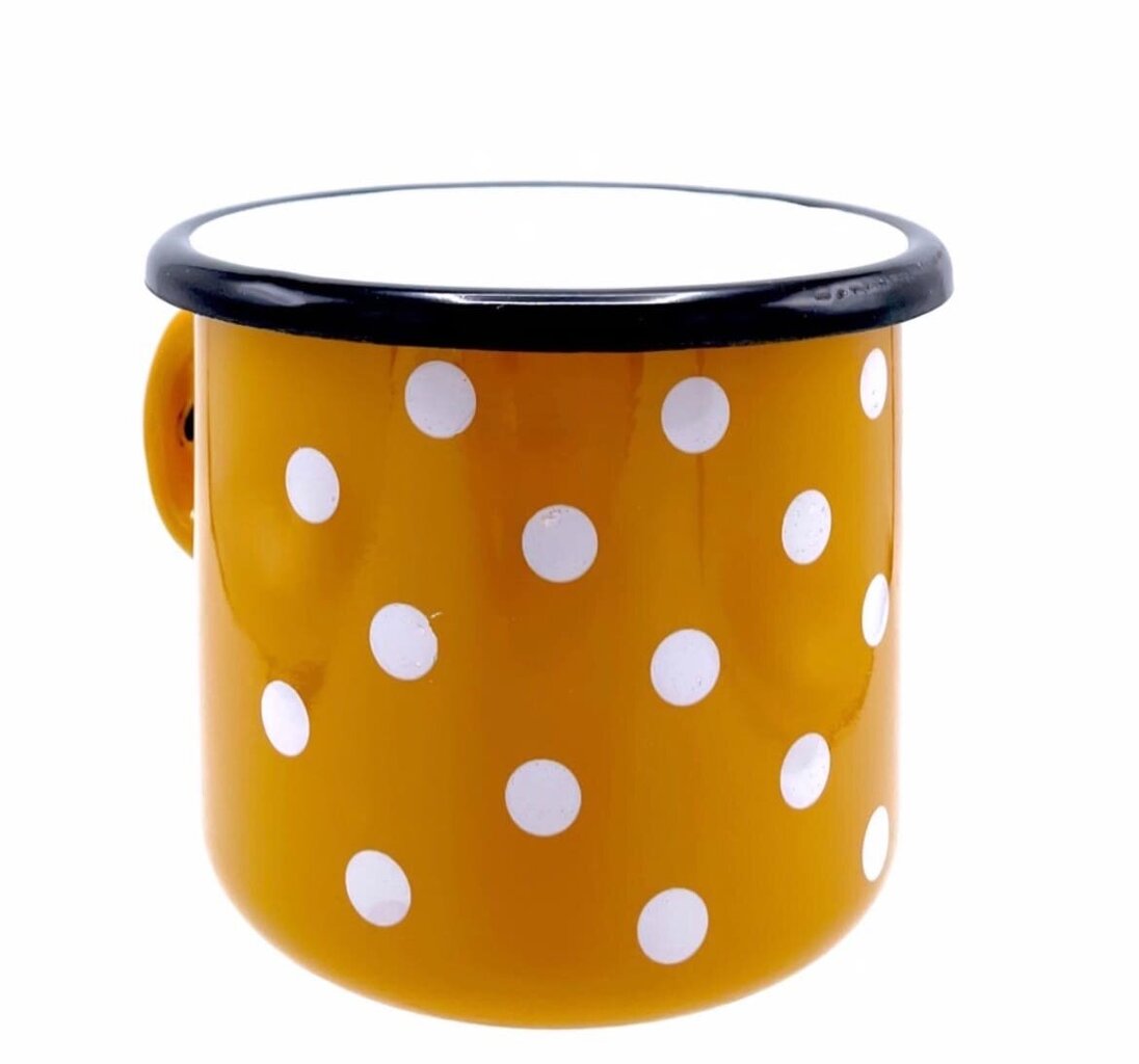 See lõbus kollane valgete täppidega emailkruus on suurepärane valik neile, kes soovivad oma kööki elavdada või nautida kuumi jooke looduses. Email on klassika, mis on tänu oma praktilisusele ja esteetilisele sarmile taas moodi tulnud.