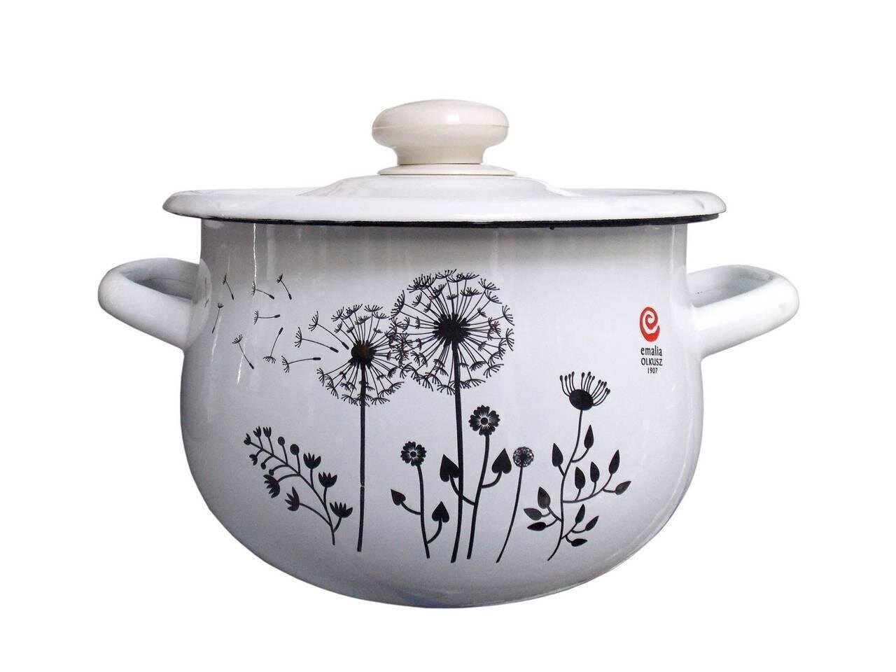See 3,5-liitrine pott, mis on valmistatud legendaarses Poola tehases “Emalia Olkusz 1907”, ühendab pikaajalised emailimistraditsioonid kaasaegse stiiliga. Valge korpus, mida kaunistavad peened mustad võilillede joonistused, saab teie köögis eriliseks aktsendiks.