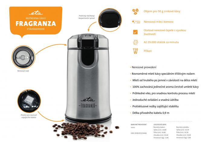 Vaatamata oma kompaktsele suurusele on ETA FRAGRANZA üllatavalt võimas. Spetsiaalne roostevabast terasest jahvatusnuga saavutab eriti suure kiiruse (kuni 29 000 pööret minutis), mis tagab ubade kiire ja ühtlase jahvatamise. Roostevabast terasest jahvatuskamber tagab, et värskelt jahvatatud kohvi ainulaadne aroom säilib 100%.