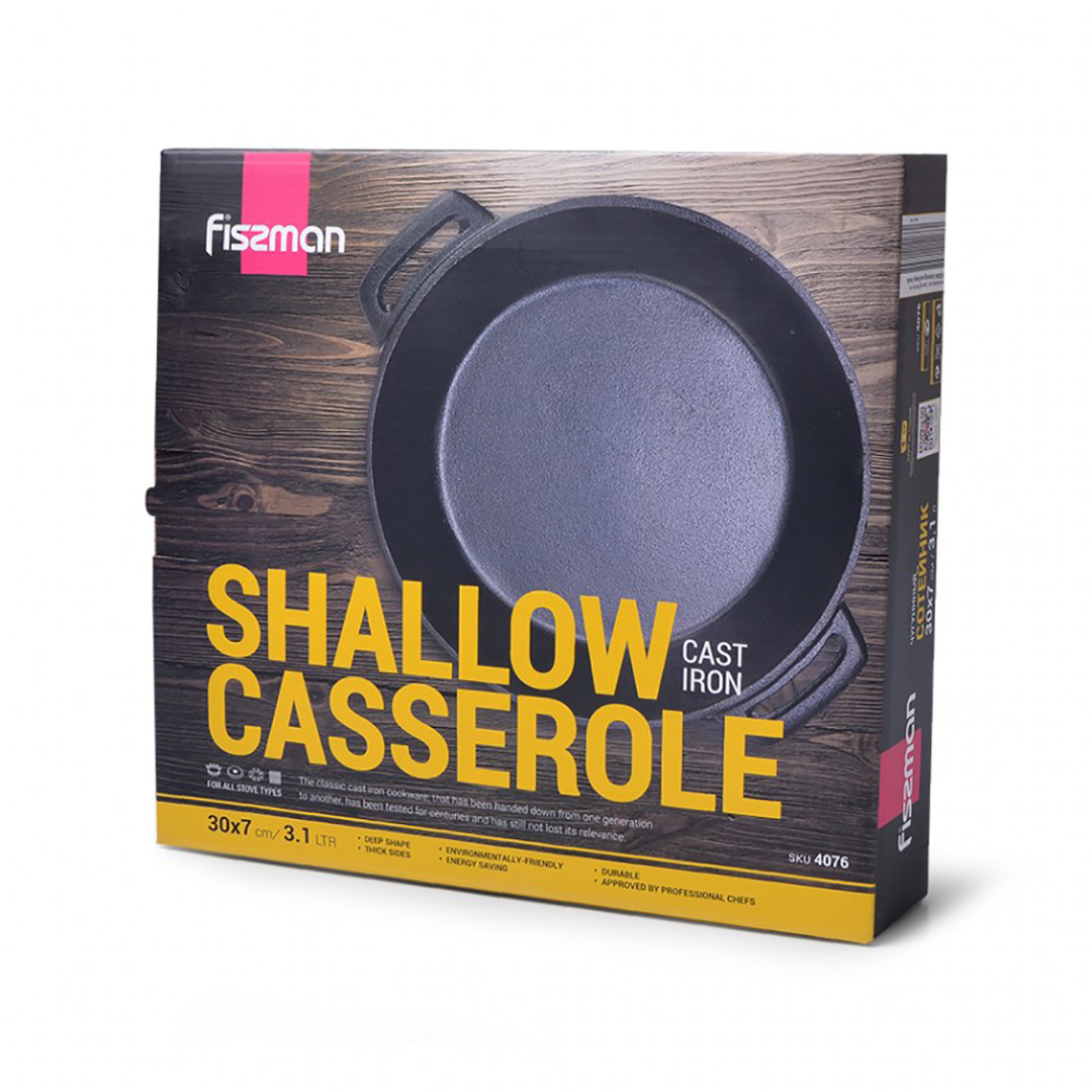 Spetsifikatsioonid Tüüp: Sügav pann / Hautamisnõu Kaubamärk: Fissman Mudel: F-4076 Materjal: Malm Läbimõõt: 30 cm Kõrgus: 7 cm Mahutavus: 3.2 L Pliiditüübid: Gaasi-, elektri-, keraamiline, induktsioonpliit Sobib kasutamiseks ahjus: Jah Tootja: Fissman (Taani) Kaal: ~4.5 kg Pakendi mõõdud: 32 x 32 x 8 cm