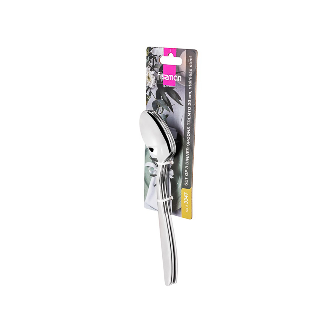 Spetsifikatsioonid Tüüp: Supilusikate komplekt Kaubamärk: Fissman Seeria: Trento Mudel: F-3347 Materjal: Roostevaba teras 18/0 Pind: Läikiv Ühikute arv: 3 Pikkus (üks lusikas): 20,5 cm Tootja: Fissman (Taani) Kaal (komplekt): ~0,2 kg Pakendi mõõtmed: 25 x 9 x 3 cm