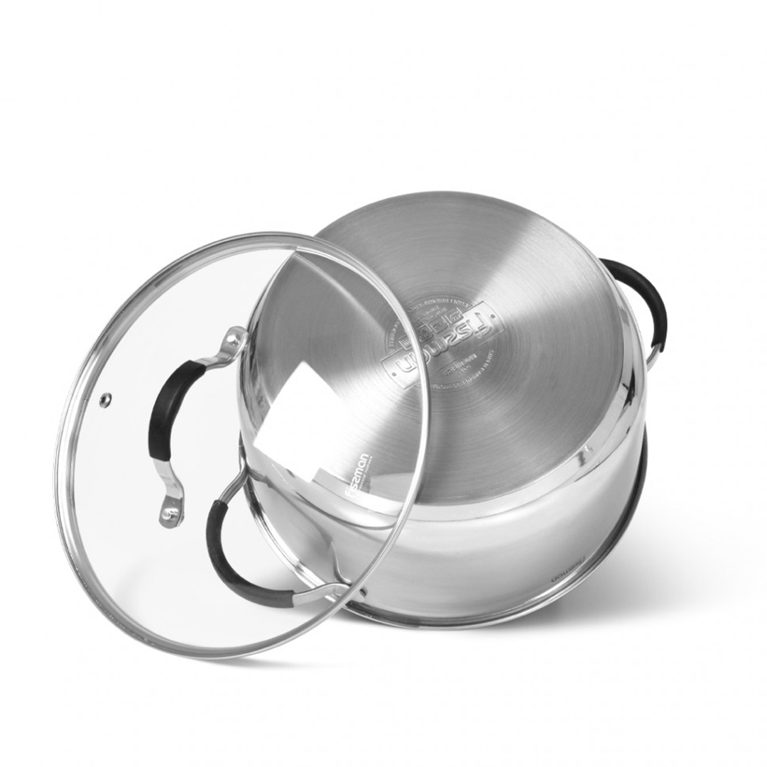 Pott on valmistatud kvaliteetsest 18/10 roostevabast terasest. Spetsiaalne 3-kihiline termoakumulatsioonpõhi tagab kiire kuumenemise ja ühtlase soojusjaotuse, säästes seega energiat. Stiilne matt viimistlus koos läikiva ribaga peal näeb välja soliidne ja karastatud klaasist kaas võimaldab teil mugavalt toiduvalmistamisprotsessi jälgida.