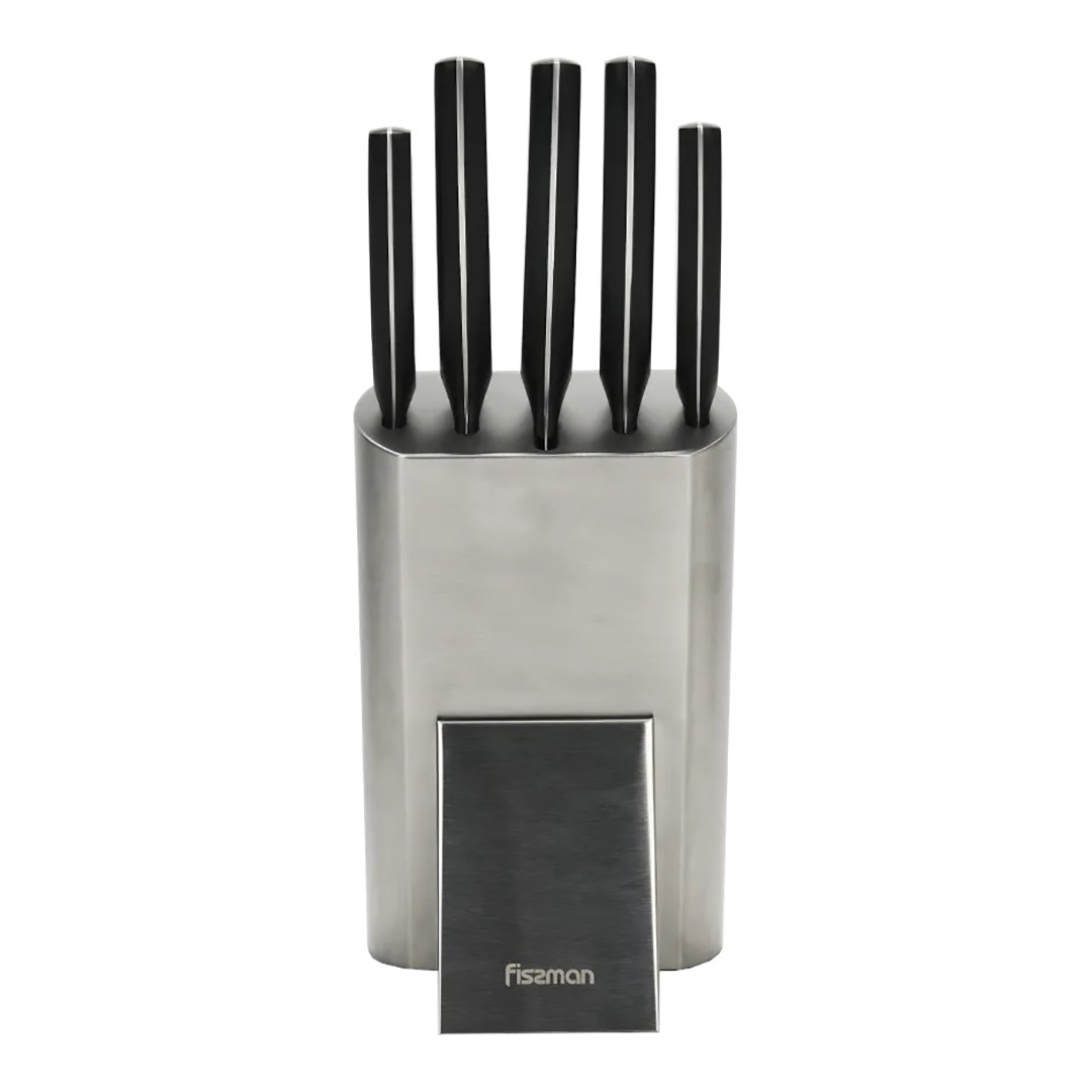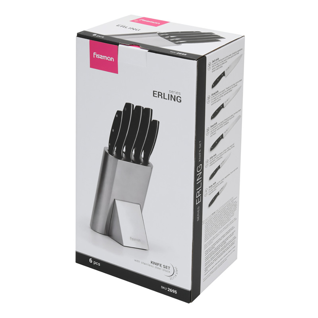 Fissmani noakomplekt “ERLING” on täielikult komplekteeritud ja stiilne lahendus igale modernsele köögile. Komplekt sisaldab viit kõige vajalikumat nuga igapäevasteks toiduvalmistamise ülesanneteks ja elegantset alust, mis mitte ainult ei taga mugavat ja turvalist noahoidmist, vaid näeb ka suurepärane välja igal tööpinnnal.