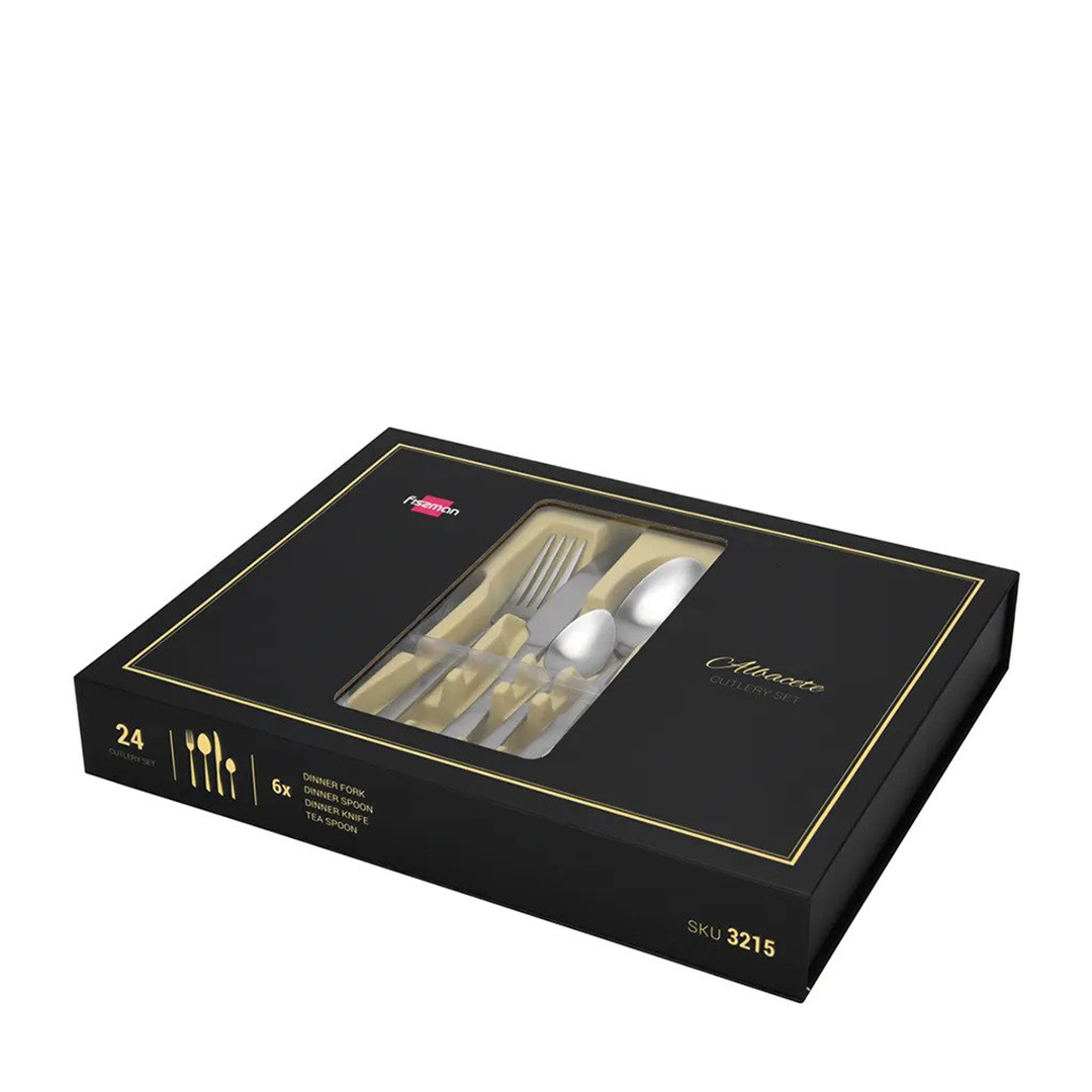 Spetsifikatsioonid Tüüp: Söögiriistade komplekt Kaubamärk: Fissman Seeria: Albacete Mudel: F-3215 Materjal: Roostevaba teras Pind: Matt Osade arv: 24 Inimeste arv: 6 Tootja: Fissman (Taani) Kaal (komplekt): ~1.5 kg Pakendi mõõtmed: 26 x 39 x 6 cm