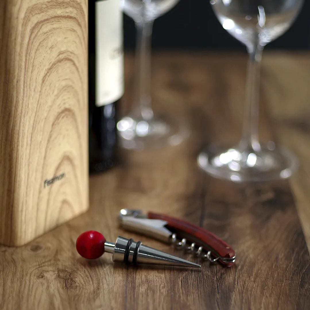 Fissmani veiniaksessuaaride komplekt on elegantne ja praktiline kollektsioon igale veinihuvilisele. Komplekt sobib suurepäraselt nii uue veinipudeli pidulikuks avamiseks kui ka lõpetamata joogi maitseomaduste säilitamiseks. Stiilses kinkepakendis esitletud komplektist saab suurepärane kingitus igaks sündmuseks.