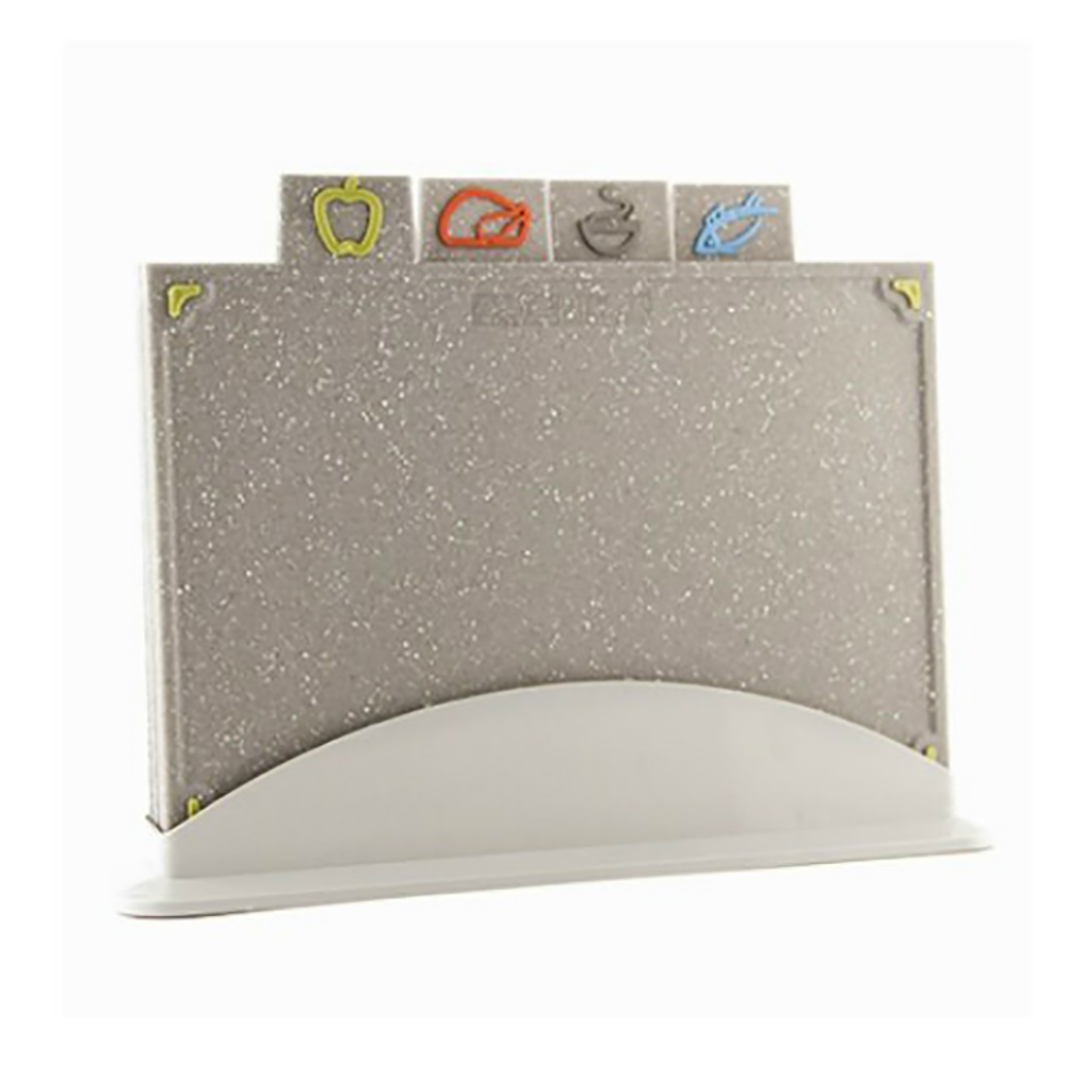 4-osaline lõikelaudade komplekt koos alusega, mis on mõeldud kala, liha, leiva ja köögiviljade lõikamise protsesside hügieeniliseks eraldamiseks.