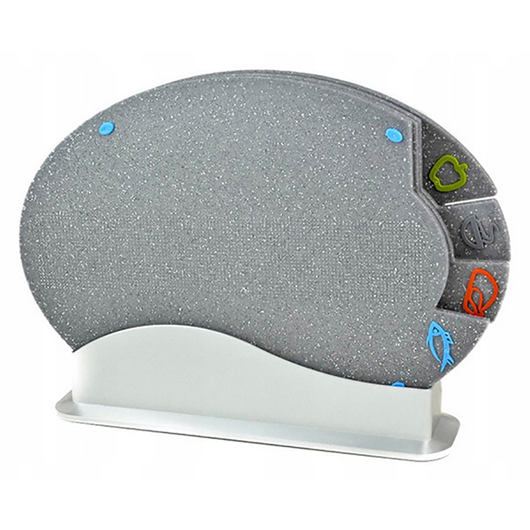 4-osaline lõikelaudade komplekt koos alusega, mis on mõeldud kala, liha, leiva ja köögiviljade lõikamisprotsesside hügieeniliseks eraldamiseks.