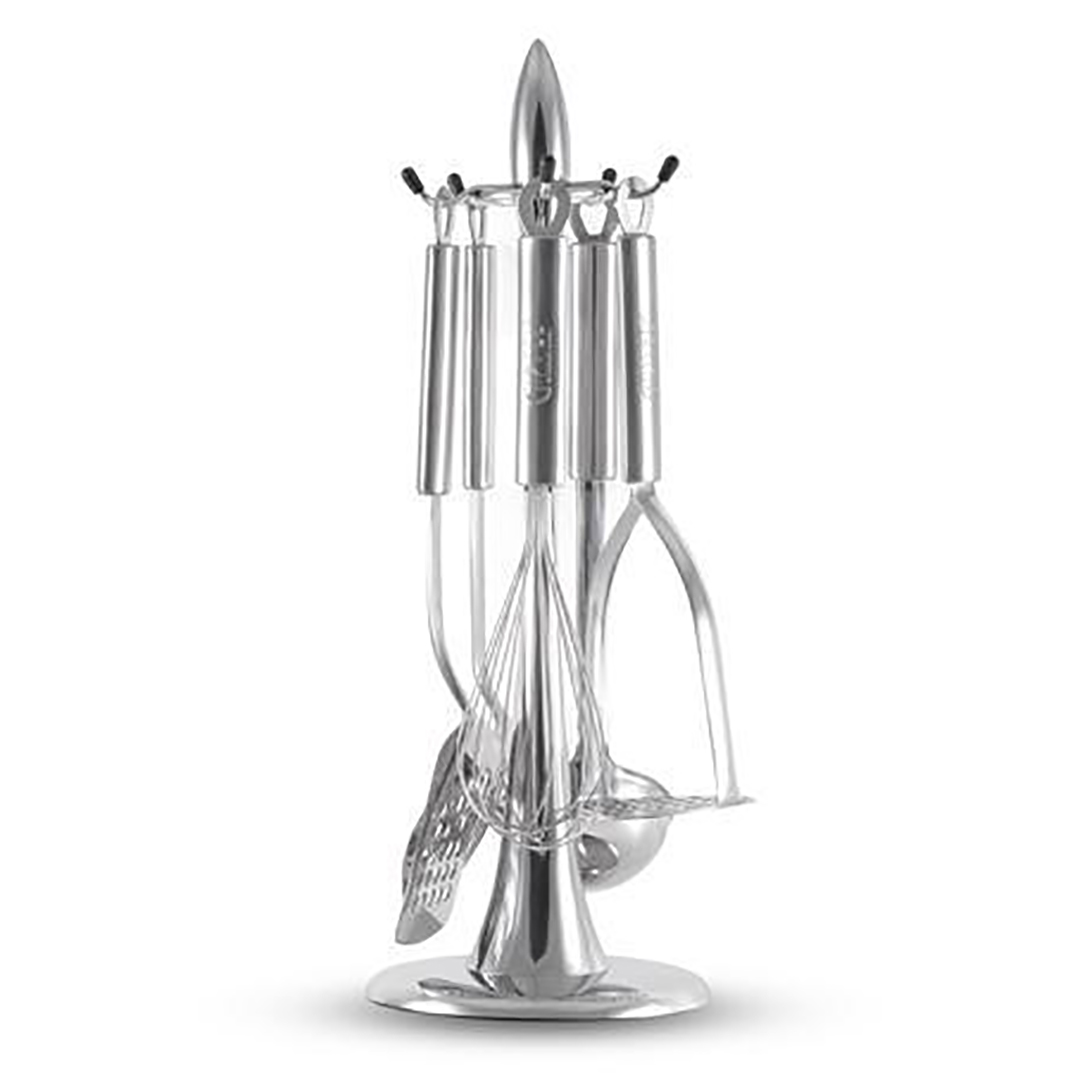 Komplekt sisaldab 5 kõige vajalikumat köögitööriista (tööriistade pikkus ~30 cm) ja universaalset alust: