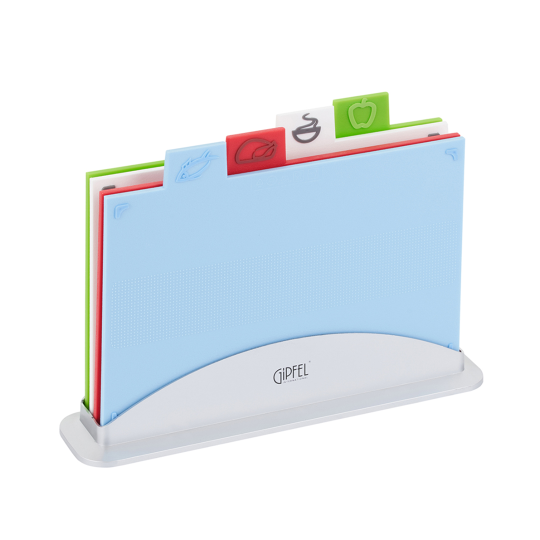 Tutvustame GIPFEL Galaxy 50963 – praktilist ja stiilset 4 lõikelaua komplekti koos alusega. See on ideaalne lahendus neile, kes hindavad hügieeni ja korda. Igal laual on spetsiaalne märgistus, mis näitab, milliste toodete jaoks see on mõeldud, seega väldite toiduainete ristsaastumist.