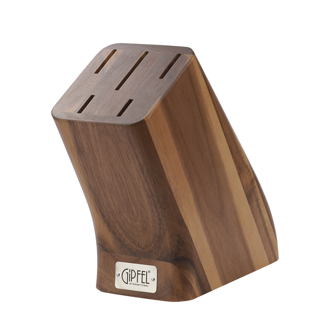 Mugavad polüpropüleenist käepidemed on ergonoomiliselt vormitud ja neil on spetsiaalne sõrme tugi, mis tagab kindla haarde. Noad ei väsita kätt isegi pikemaajalisel töötamisel. Elegantne puidust alus võimaldab kõiki nuge hoida korras, turvaliselt ja alati käepärast.
