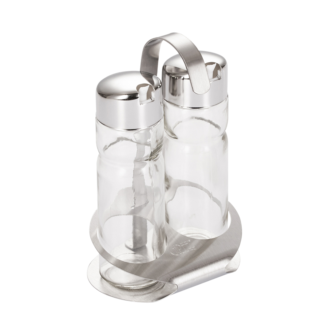 Komplekti kuuluvad kaks identset silindrilist klaasanumat vedelikele toodetele mõõtmetega 11,6×8,9×18,7 cm roostevabast terasest alusel.