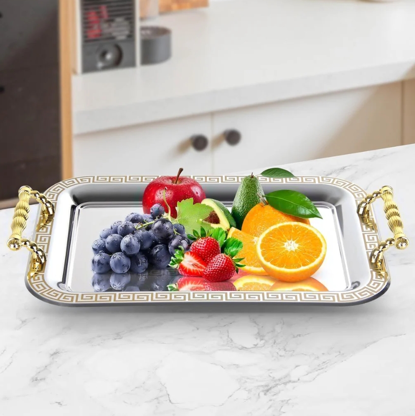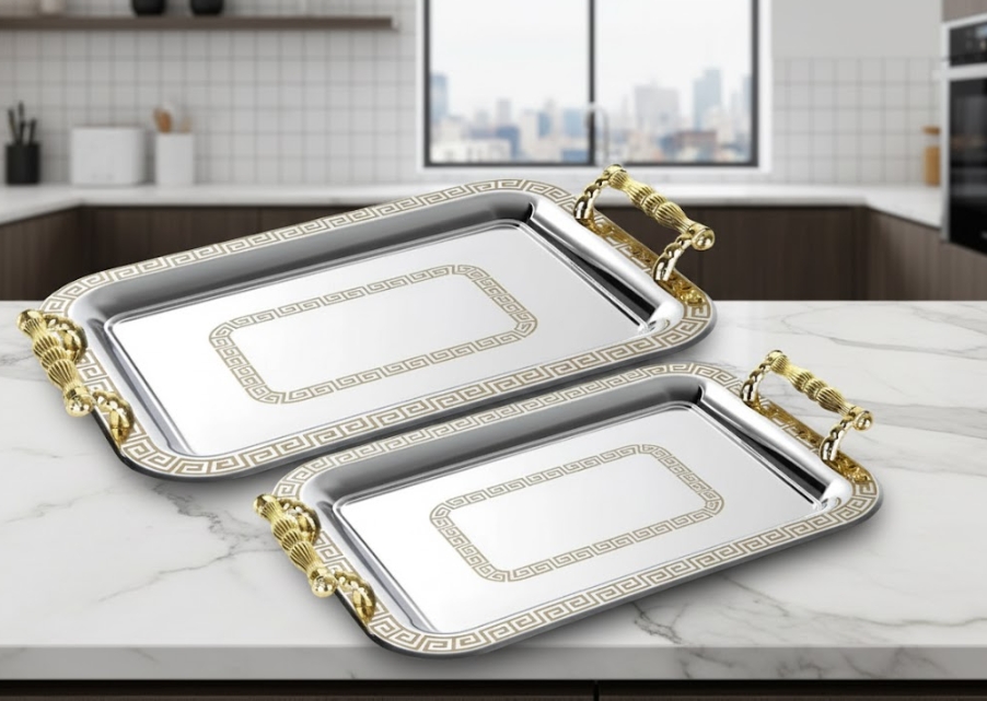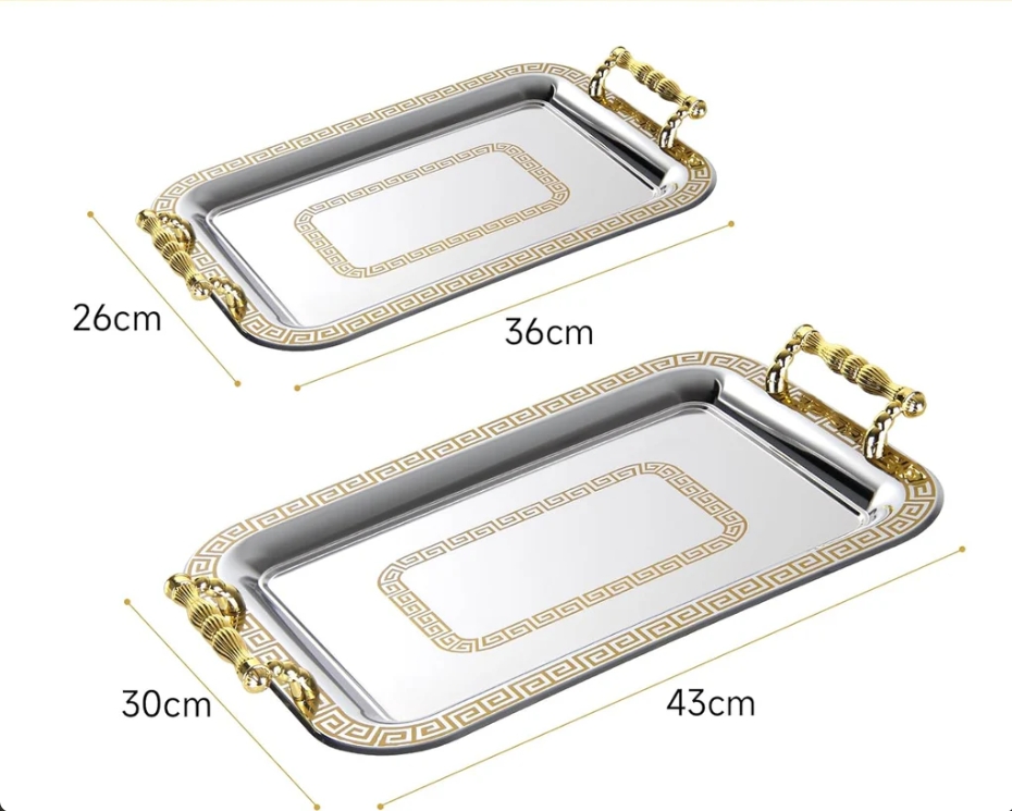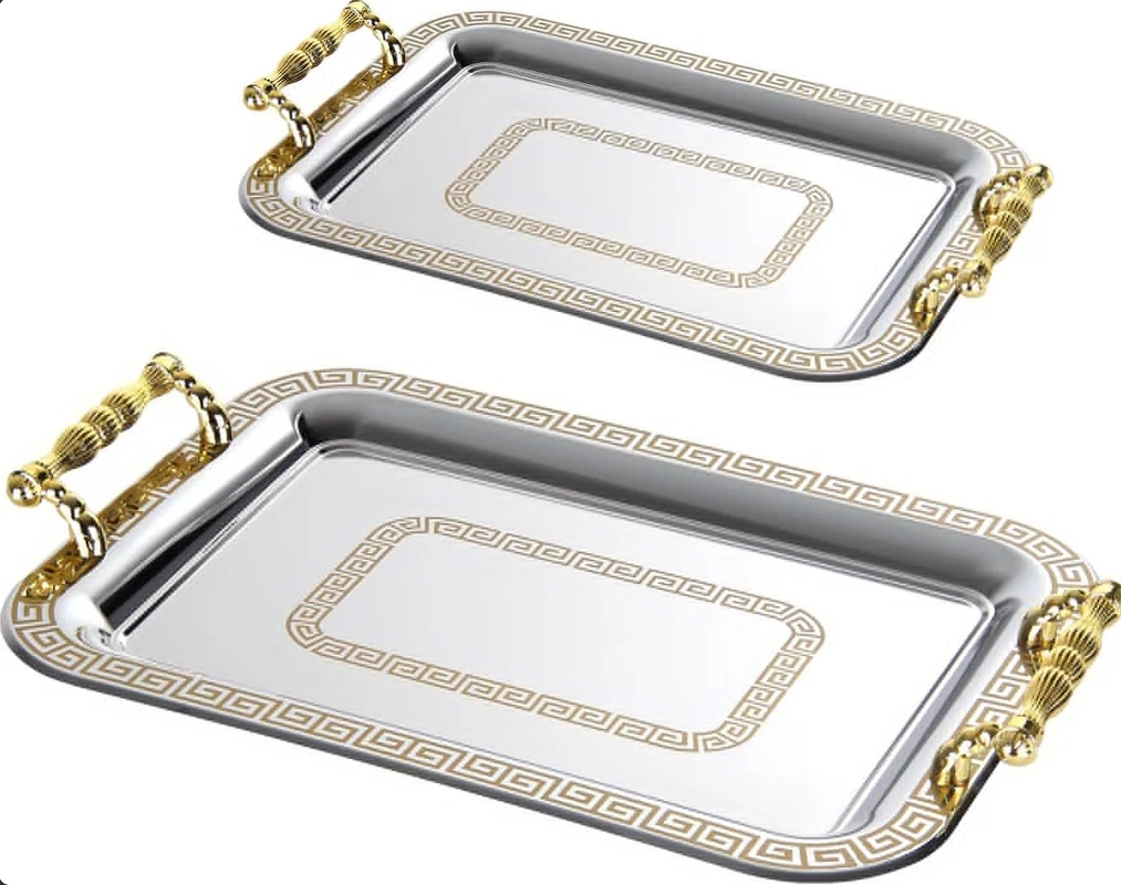 See stiilne 2-osaline kandikute komplekt ühendab endas luksusliku välimuse praktilise mugavusega. Ideaalne jookide, suupistete või toitude serveerimiseks ning on elegantne lisa igale sündmusele. Kandikud on valmistatud kvaliteetsest roostevabast terasest ja vastupidavad käepidemed on valmistatud plastikust, mis imiteerib kuldset metalli.