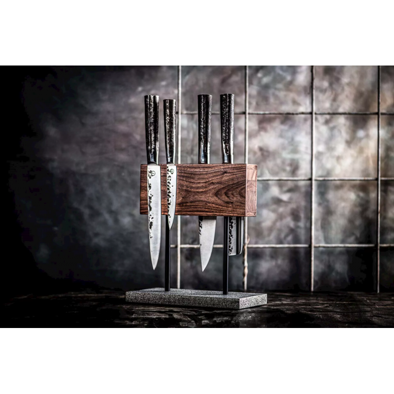 See magnetplokk sobib kasutamiseks mõlemalt poolt ja on valmistatud pähklipuust. See noaplokk seisab looduslikul kivist alusel. Selle pikkus on 25 cm, laius 12 cm ja kõrgus 27,5 cm.