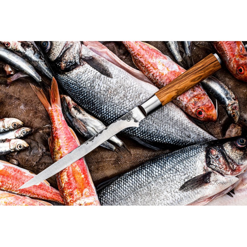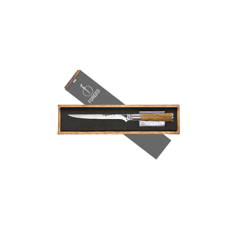 Forged Olive seeria fileerimisnuga – suurepärane valik neile, kes hindavad täpset lõikamist. Käsitsi valmistatud ja loodusliku puidust käepidemega tööriist sobib suurepäraselt kalafilee, linnuliha või singi valmistamiseks.