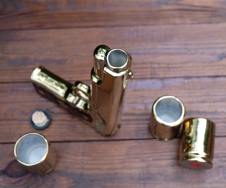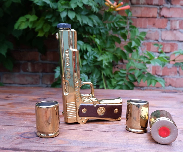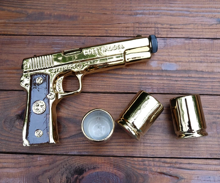 Tutvustame originaalset kinkekomplekti – kuldset värvi püstolit “Colt”. See pole mitte ainult stiilne suveniir, vaid ka funktsionaalne anum jookide jaoks. Komplekt paistab silma oma detailidega: koos “relvaga” on komplektis kolm pitsi, mis on stiliseeritud kui padrunikestad (hülsid). See on suurepärane valik neile, kes otsivad kingitust jahimehele, korrakaitsjale või relvahuvilisele.