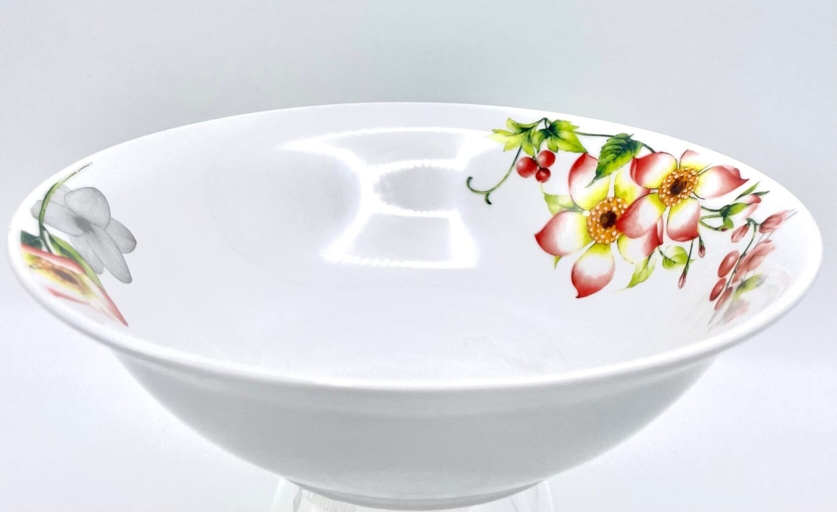 See 20 cm läbimõõduga keraamiline kauss ühendab klassikalise stiili looduslike motiividega. Valgel taustal asetsevad õrnad õied annavad nõule kergust ja elegantsi. See on nõu, mis mitte ainult ei täida praktilist funktsiooni, vaid on ka peamine lauaserveerimise aktsent nii argipäeval kui ka pühadel.
