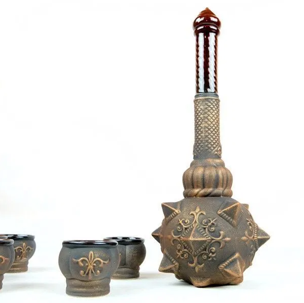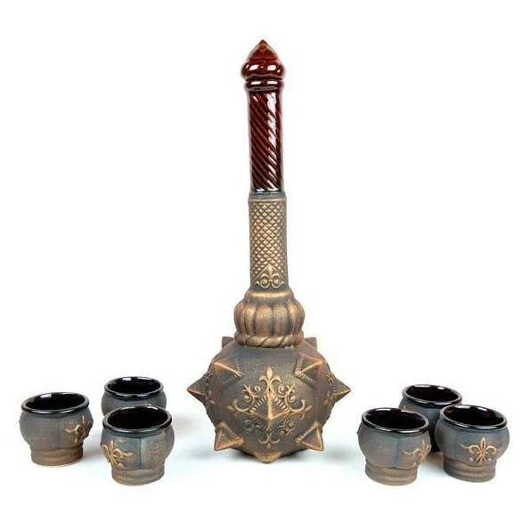 Komplekti põhielement on “kuokos” kujuline keraamiline karahvin, mille viimistlus imiteerib pronksi. Unikaalne, detailne disain tõmbab pilku ja saab suurepäraseks interjööri aktsendiks. Komplektis olevad kuus pitsi on stilistiliselt karahviniga kooskõlas, luues harmoonilise ja esteetiliselt meeldiva koosluse.