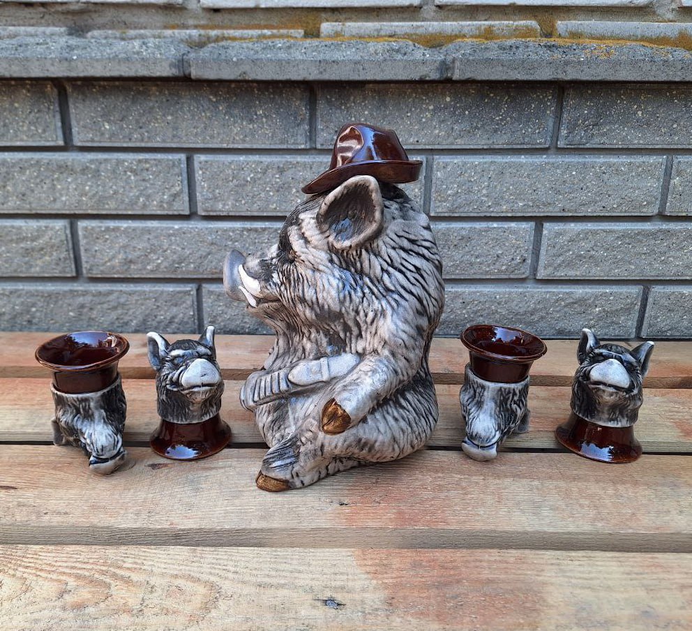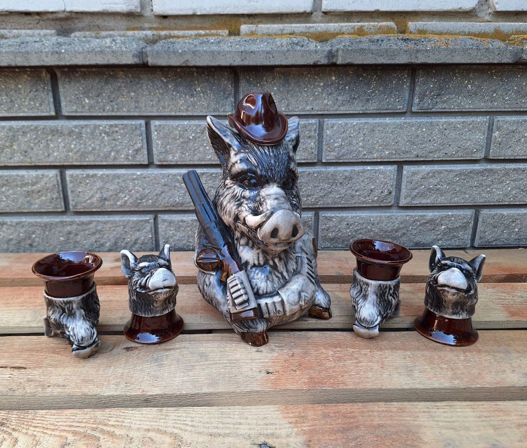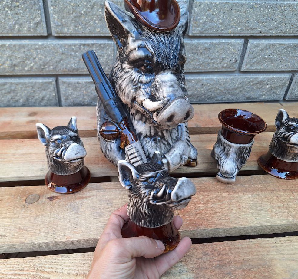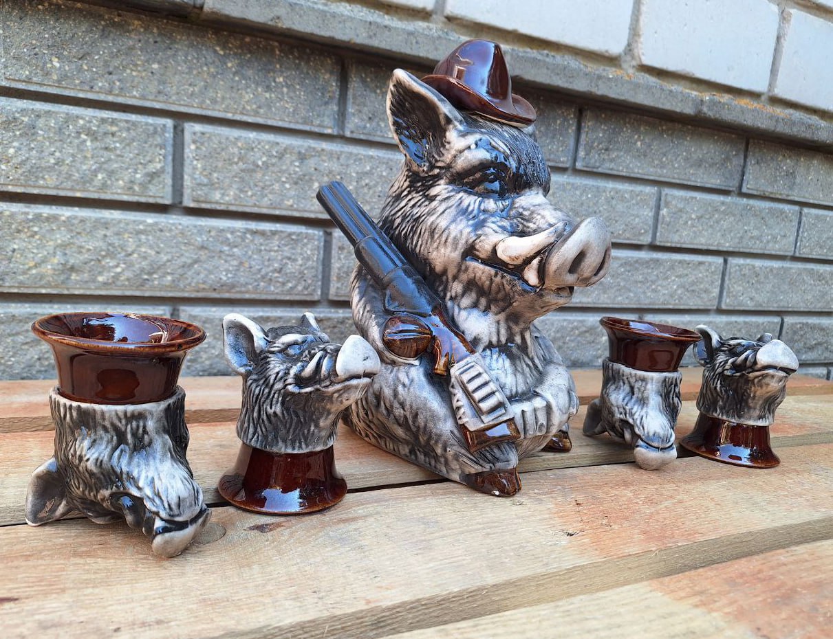 Komplekti kuulub muljetavaldav püssiga metssiga kujuke, mis on mahukas karahvin, ja neli originaalset pitsi, mis kujutavad metssigade päid. Iga detail on valmistatud hoolikalt ja huumoriga, mistõttu saab sellest komplektist suurepärane kaunistus suvilas, jahimeeste trofeetoas või lihtsalt kodubaaris.