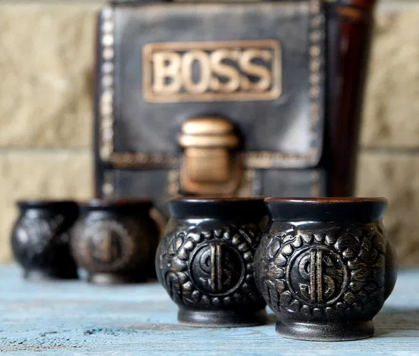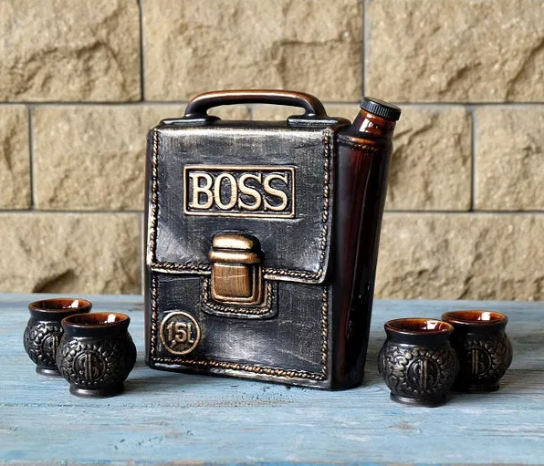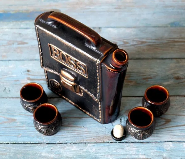 Komplekti kuulub ärimapi kujuline keraamiline karahvin soliidse kirjaga “BOSS” ja neli sellega sobivat pitsi. See komplekt on suurepärane kaunistus iga mehe kontoris või kodubaaris, täiendades kollektsiooni ja andes ruumile eksklusiivsust.