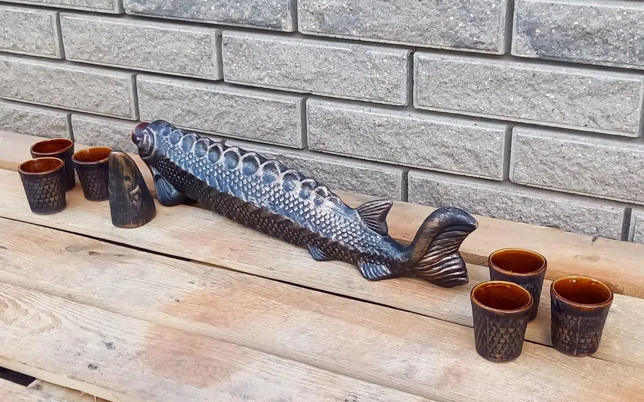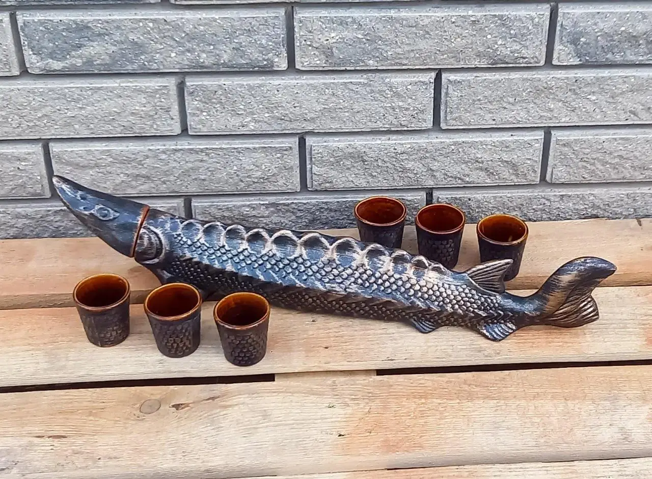 Komplekti kuuluvad muljetavaldava suuruse ja väga detailse disainiga tuura kujuline karafin ja kuus sellele sobivat pitsi. See on originaalne interjööri kaunistus, mis sobib suurepäraselt nii koju kui ka maakodusse, eriti sinna, kus väärtustatakse kalastusteemat ja loodusmotiive.