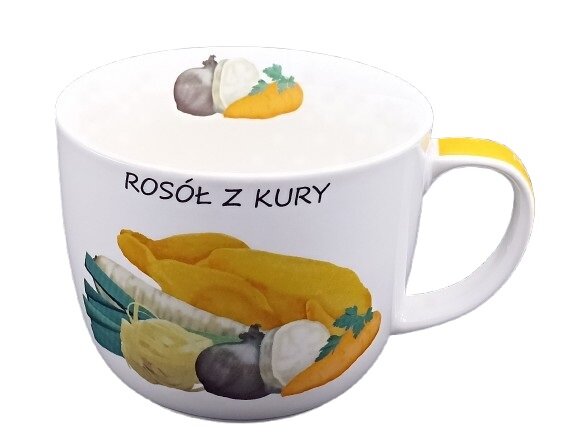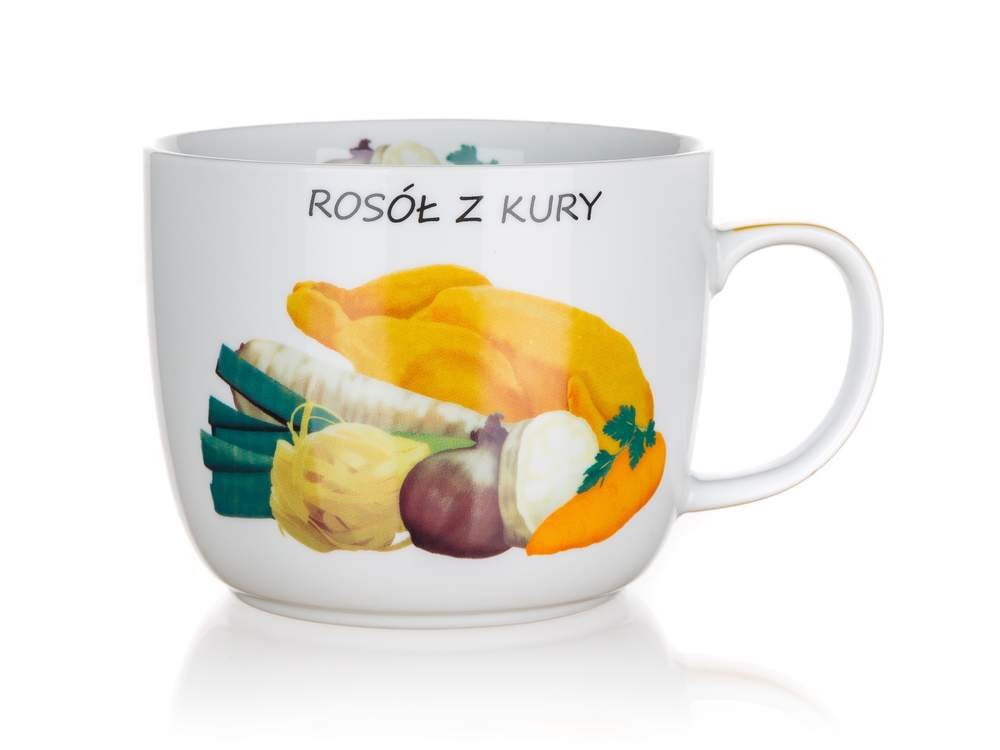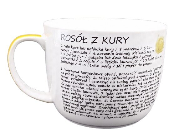 - Visuaalne atraktiivsus: Kruusi esikülge kaunistab hubane pilt, mis kujutab puljongi jaoks vajalikke koostisosi – kana, porgandeid, peterselli ja maitseaineid. Ülaosas olev kiri “ROSÓŁ Z KURY” annab nõule autentset sarmi.