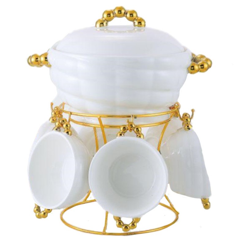 - Keraamilisi osi on 8 (üks supikauss, üks kaas ja kuus kaussi). Lisaks on komplektis metallist alus kogu komplekti hoidmiseks.