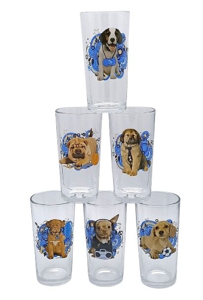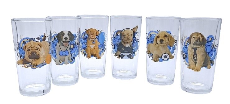 See 6-osaline klaaside komplekt võlub iga loomasõpra. Iga klaas on kaunistatud erineva lõbusa kutsikapildiga, millel on sinised graafilised elemendid ja aksessuaarid (kõrvaklapid, lips, kaamera jne), seega saab iga pereliige või külaline valida oma lemmiku.