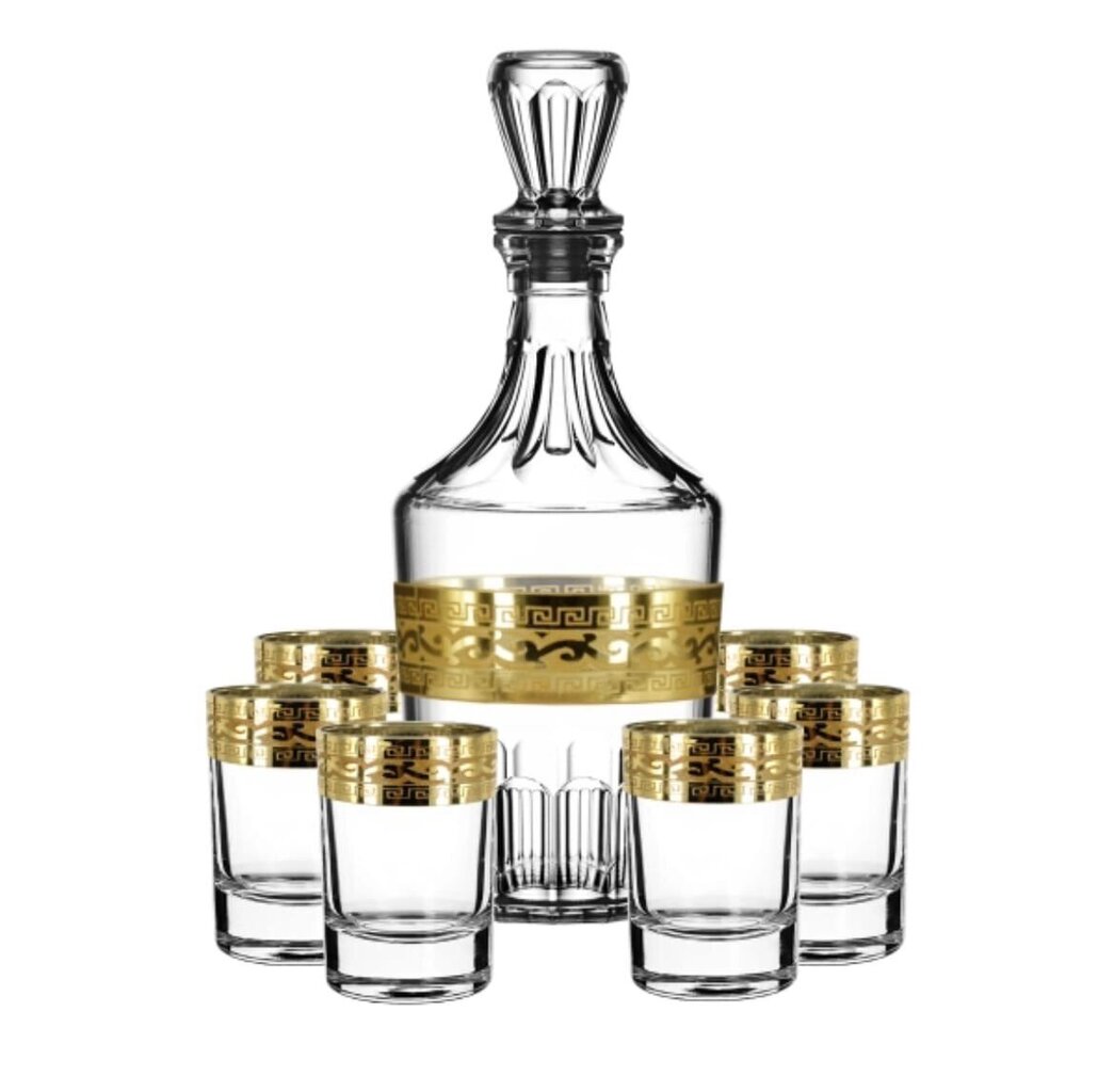 - Disain: Läbipaistev klaas on rikkalikult kaunistatud kullavärvi ribadega, millel on klassikaline kreeka ornament (meander) ja stiliseeritud mustrid. See annab nõudele antiikse luksuse tunde.