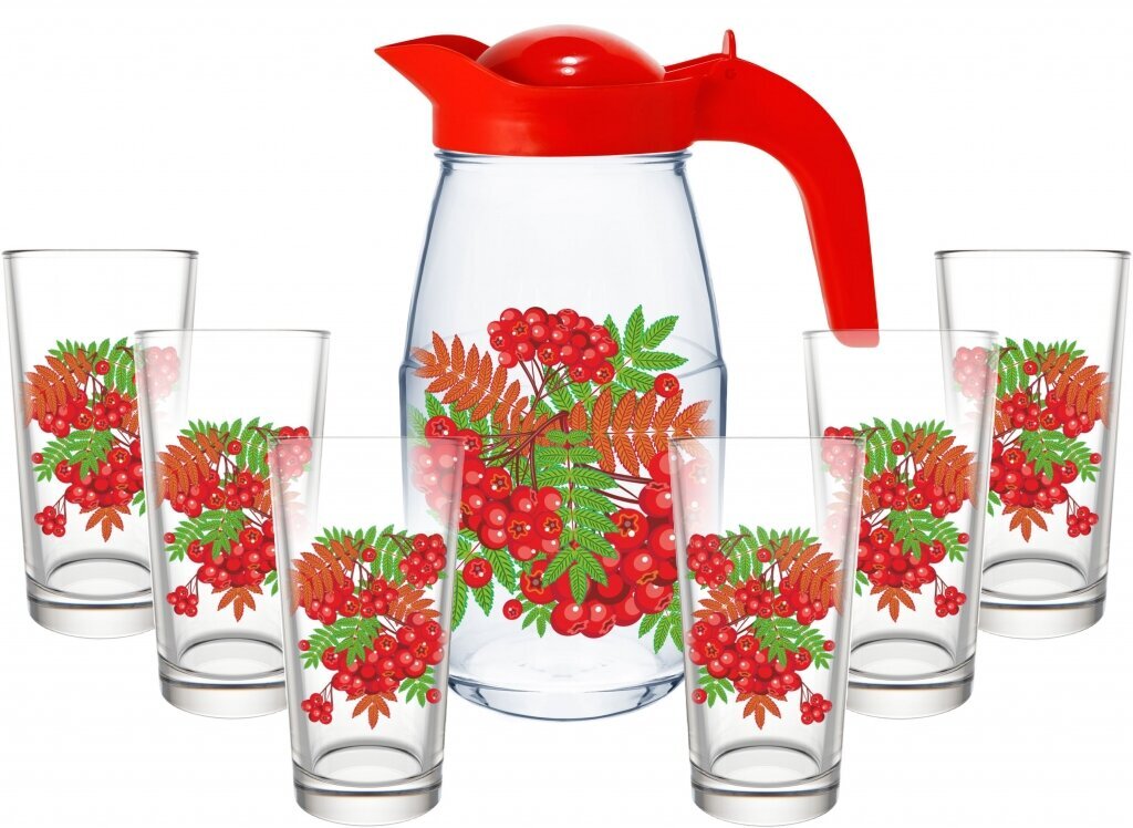 See 7-osaline joogikomplekt on asendamatu atribuut kuumadel suvepäevadel. Elegantne klaasdisain sobib igale peolauale, praktilised lahendused võimaldavad aga jooke nautida nii toas kui ka õues.