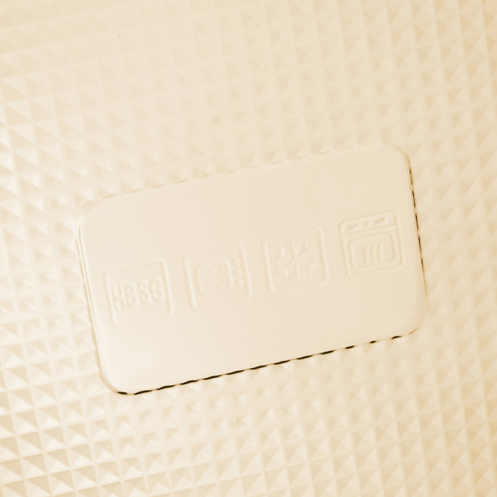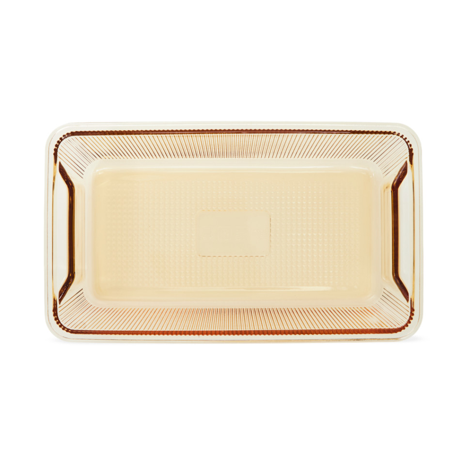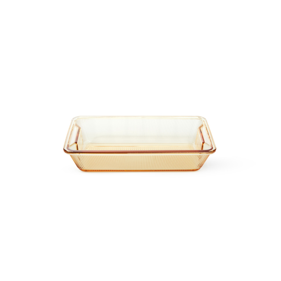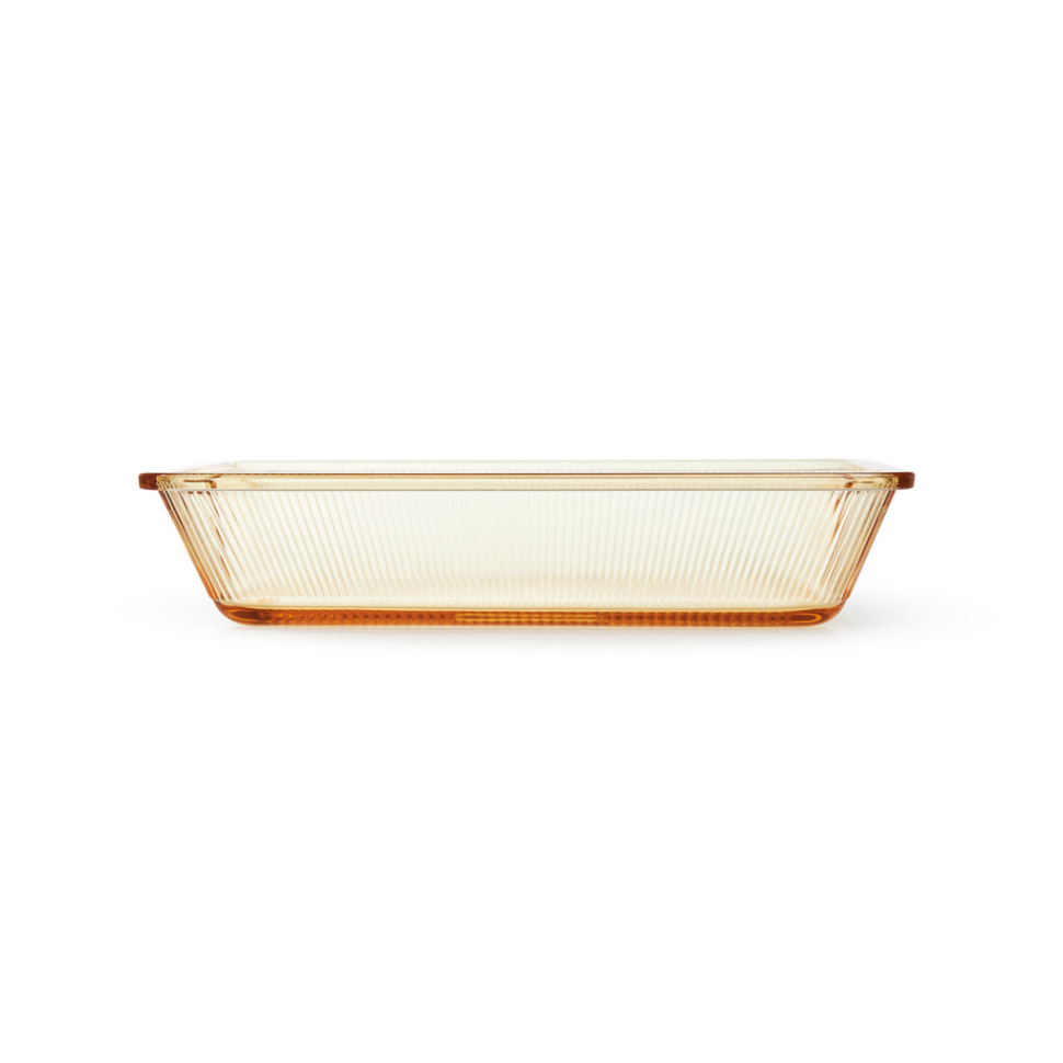 See nõu on valmistatud vastupidavast borosilikaatklaasist, mis paistab silma erakordse vastupidavusega kõrgetele temperatuuridele. Vormi disain on väga eriline – merevaigutooniga klaasil on stiilsed soonitud servad ja mugavad integreeritud käepidemed lühikestel külgedel. Nõu põhjal on spetsiaalne reljeefne (tekstureeritud) kate, mis aitab säilitada toidu struktuuri.