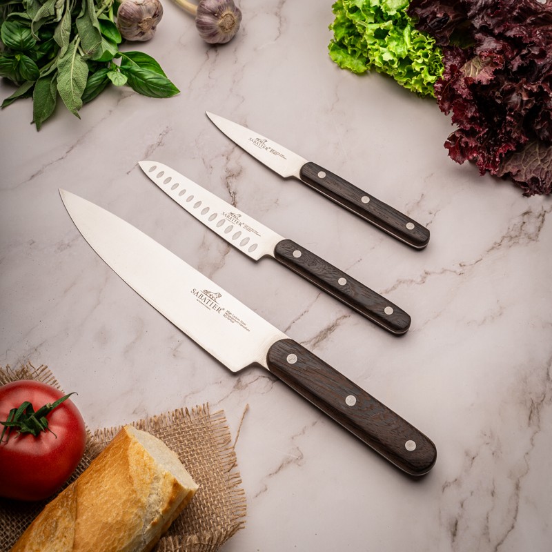 Olete professionaalne kokk või alles õpite toiduvalmistamist, Sabatier® International noad on täiuslikud lauariistad igaks olukorraks. See 3-osaline komplekt sisaldab 9 cm teraga puu- ja köögivilja lõikamisnuga, 13 cm teraga abinuga ja 20 cm tsehhi nuga X50CrMoV15 roostevabast terasest lõigetega. Suurem süsinikusisaldus terases võimaldab nugeadel olla tugevamad. Selline teras on ka väga vastupidav ja vastupidav löökidele ja korrosioonile. Tugev ja usaldusväärne noa käepide on valmistatud POM-plastikust koos 3 roostevabaterase tolliga. Need noad on mõeldud kasutamiseks igas köögis ja pakuvad aastateks erakordset väärtust – neid hinnatakse kõrgelt kokkade ja toiduvalmistamishuviliste poolt üle kogu maailma.